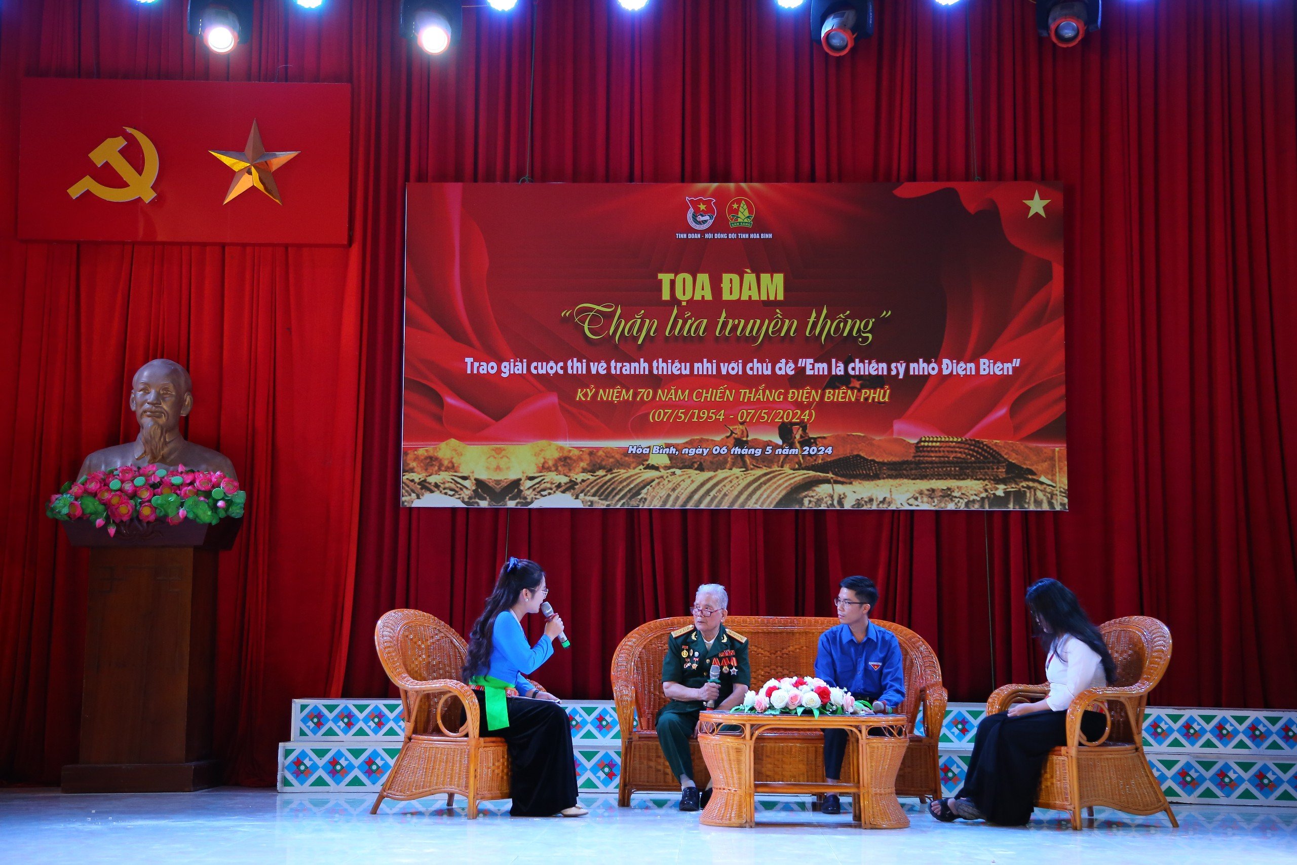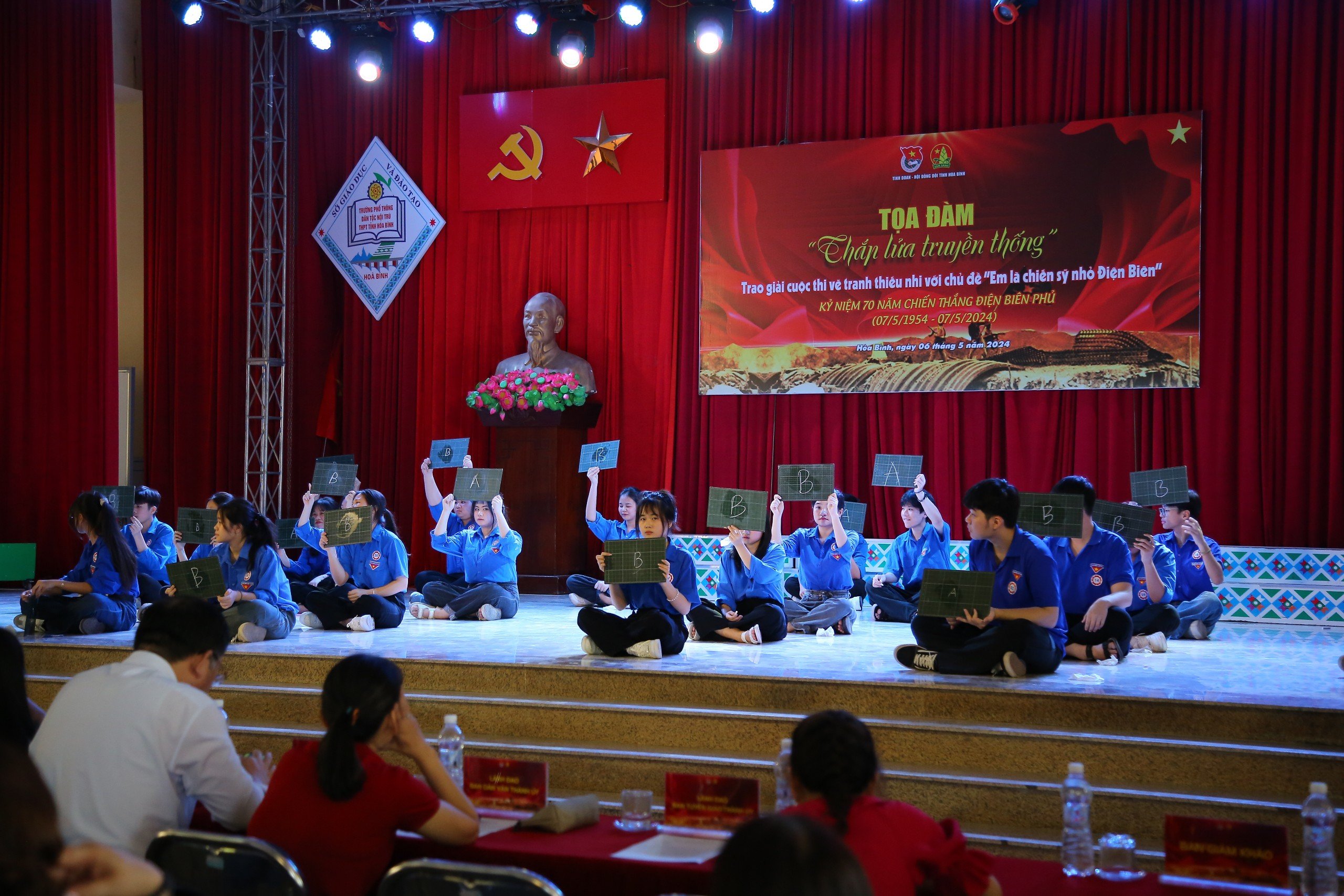 Nhằm tạo sân chơi bổ ích cho các bạn đoàn viên, thanh niên nhớ lại những dấu mốc lịch sử quan trọng của Chiến thắng lịch sử Điên Biên Phủ, những truyền thống vẻ vang được các thế hệ cha anh thực hiện trong quá trình xây dựng và bảo vệ Tổ quốc, trong khuôn khổ chương trình Ban Tổ chức đã tổ chức Cuộc thi Rung Chuông vàng kỷ niệm 70 năm Chiến thắng Điện Biên Phủ với các thí sinh đến từ trường Phổ thông dân tộc Nội trú THPT tỉnh Hòa Bình. Cuộc thi đã diễn ra với khí thế sôi nổi, các thí sinh đã có sự đầu tư, chuẩn bị chu đáo, nắm vững các kiến thức lịch sử về “Chiến thắng Điện Biên Phủ: Lừng lẫy năm châu – Chấn động địa cầu”.