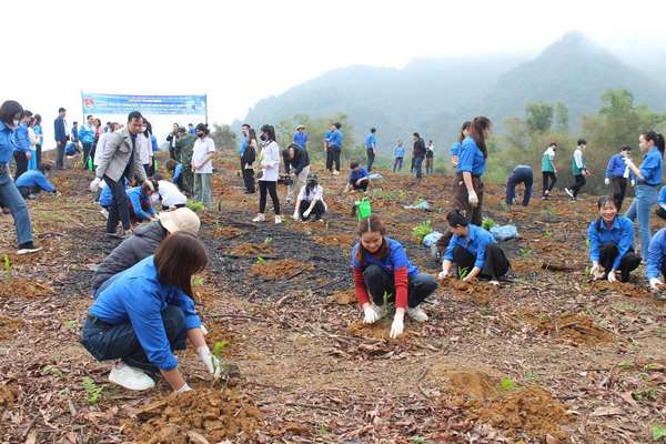 Các đại biểu tham gia trồng cây xanh hưởng ứng ra quân Tháng Thanh niên tại thôn Chùa, xã Phú Thành.