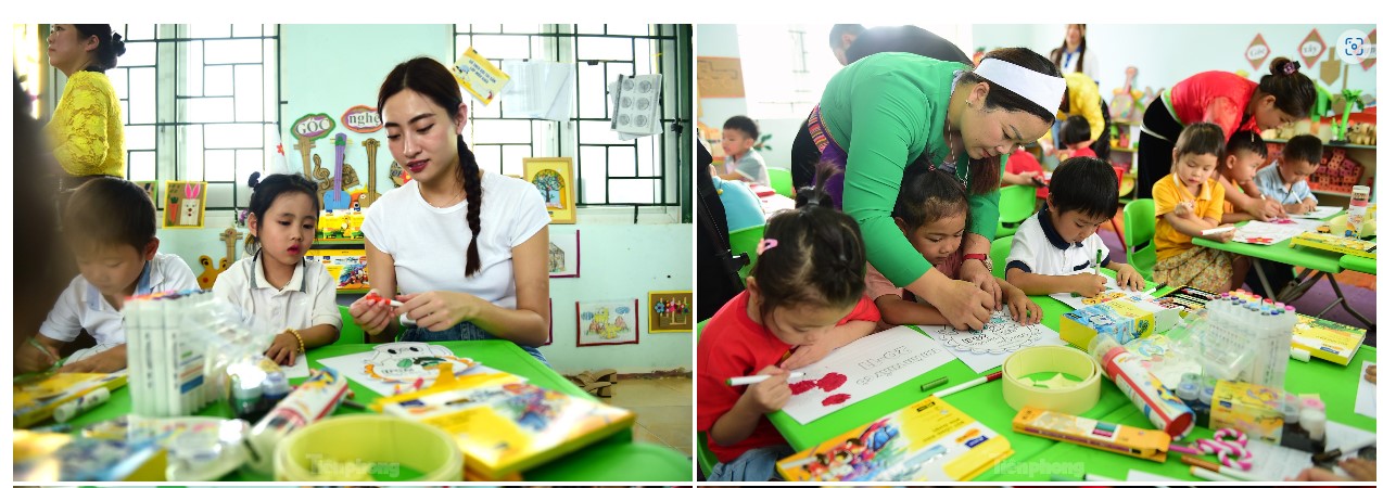 Hoa hậu Lương Thùy Linh và cô giáo Quách Thị Bích Nụ, cùng các cô giáo và các em học sinh tham gia hoạt động "lớp học sáng tạo" vẽ tranh, tạo thiệp tri ân thầy cô giáo nhân Ngày Nhà giáo Việt Nam 20/11. Ảnh: Xuân Tùng