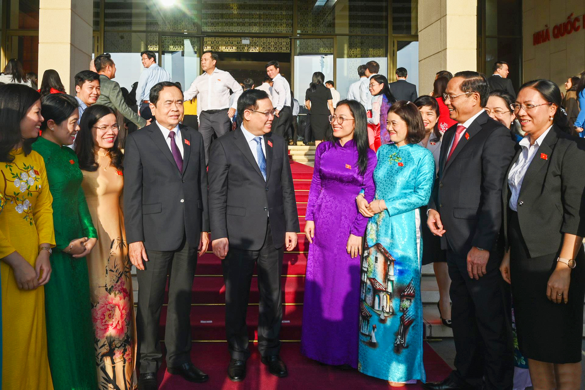 Ủy viên Bộ Chính trị, Chủ tịch Quốc hội Vương Đình Huệ trò chuyện với các đại biểu Quốc hội trẻ khóa XV_Ảnh: TTXVN