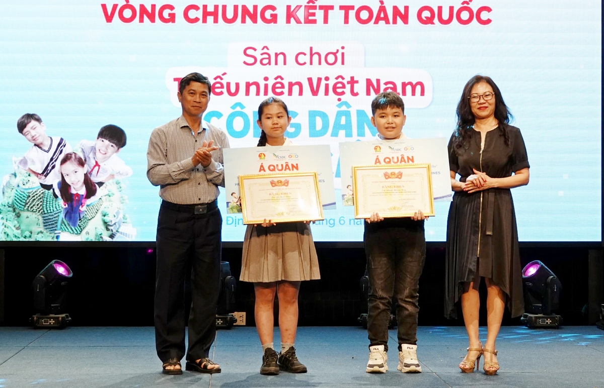 Anh Lê Anh Quân, Phó Chủ tịch Hội đồng Đội T.Ư, Giám đốc Trung tâm Hỗ trợ và Phát triển Thiếu nhi Việt Nam, Trưởng Ban Tổ chức sân chơi và chị Nguyễn Thị Mai Hữu, Trưởng ban Quản lý Đề án Ngoại ngữ Quốc gia, Bộ Giáo dục và Đào tạo trao giải Ba cho các thí sinh