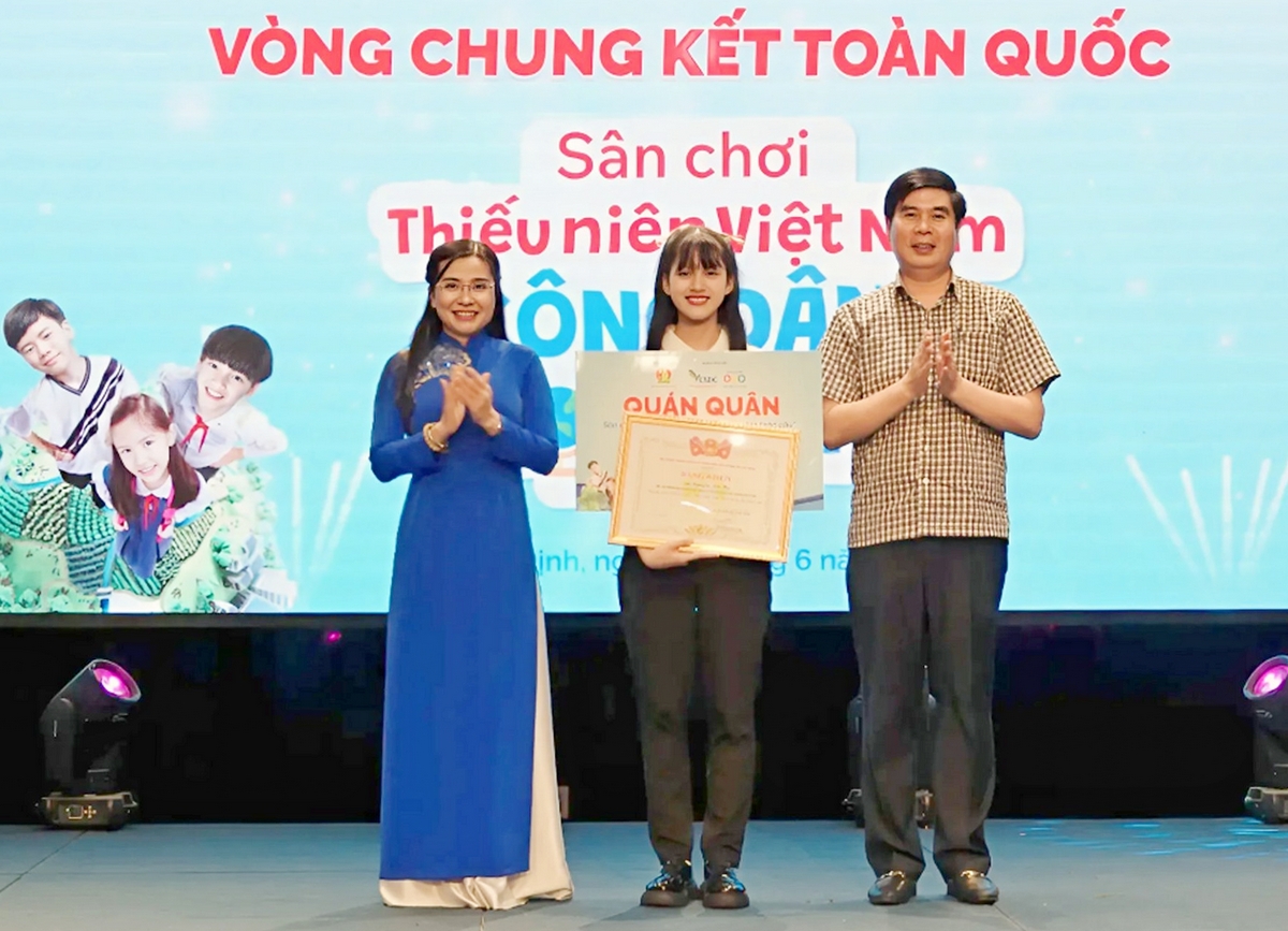 Đồng chí Nguyễn Phạm Duy Trang - Bí thư T.Ư Đoàn, Chủ tịch Hội đồng Đội T.Ư và đồng chí Lâm Hải Giang - Phó Chủ tịch UBND tỉnh Bình Định trao giải Nhất cho em Nguyễn Trà My