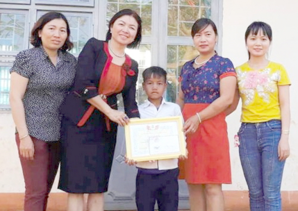 Gơng (giữa) nhận giấy khen và phần thưởng của nhà trường. Ảnh: Trần Hóa -VNE |