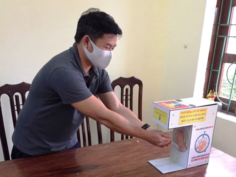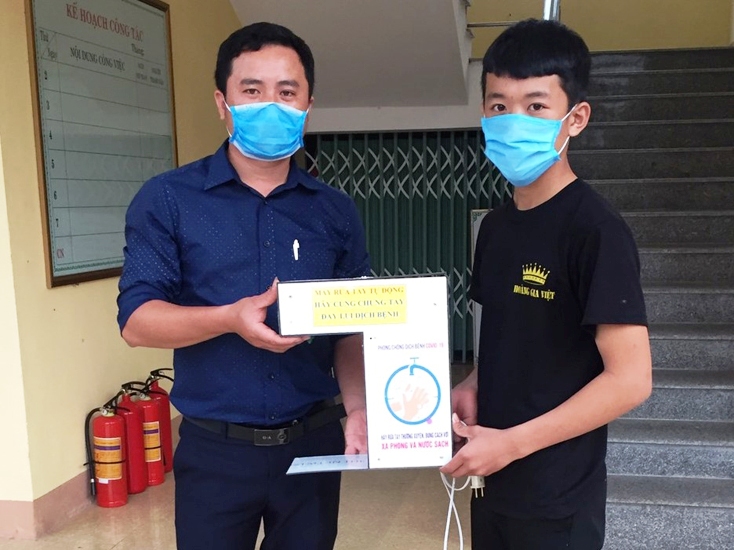 Những ngày qua, nhiều người dân và cán bộ đến xã Vạn Ninh (huyện Quảng Ninh) làm việc đều thấy chiếc máy rửa tay tự động với nhiều dòng thông điệp khác nhau được ghi trên đó. Chủ nhân của chiếc máy này là em Trần Minh Chung, học sinh lớp 9/1, Trường THCS Vạn Ninh chế tạo rồi đem tặng cho xã. Chỉ cần đưa tay ra trước máy, hệ thống cảm biến sẽ tự động phun ra một lượng dung dịch rửa tay đủ để sát khuẩn rất an toàn và tiện lợi.