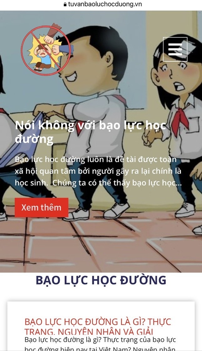 Trong đó, website: http://tuvanbaoluchocduong.vn xây dựng các chuyên mục phản ánh ảnh hưởng của mạng xã hội đến bạo lực học đường; Hành vi bạo lực học đường đến sức khỏe tâm thần ở lứa tuổi học sinh; Các biện pháp học sinh có thể tự áp dụng để phòng ngừa những tác động tiêu cực từ mạng xã hội hay tự bảo vệ bản thân trước những hành vi bạo lực học đường, bạo lực trên không gian mạng…