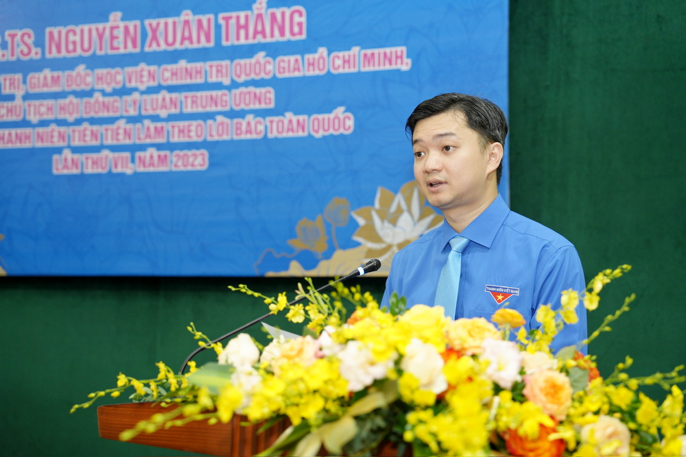 Đồng chí Nguyễn Minh Triết - Bí thư T.Ư Đoàn, Chủ tịch Hội Sinh viên Việt Nam báo cáo về Đại hội thanh niên tiên tiến làm theo lời Bác toàn quốc lần thứ VII, năm 2023