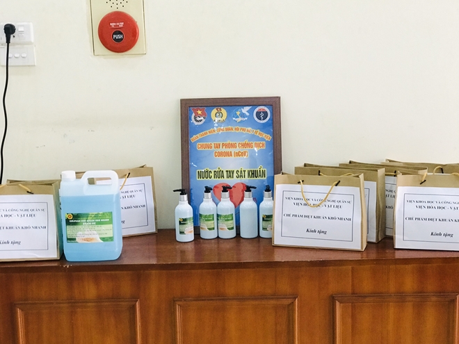 Vừa qua, Đoàn thanh niên Viện Khoa học và Công nghệ Quân sự đã trao tặng 50 lọ chế phẩm diệt khuẩn khô nhanh DKKN-VC. Đây là sản phẩm do Viện Hóa học - Vật liệu nghiên cứu, sản xuất được Bộ Quốc phòng đánh giá cao, đưa vào sử dụng trong toàn quân, nhất là các khu cách ly tập trung người nghi nhiễm Covid 19 do Bộ Quốc phòng quản lý. Được biết, Viện là đơn vị sản xuất nước sát khuẩn cung cấp cho các bệnh viện dã chiến, và đã trao tặng hàng loạt chế phẩm này đến nhiều cơ quan, đơn vị trên địa bàn Hà Nội góp phần không nhỏ vào công tác đẩy lùi dịch bệnh.