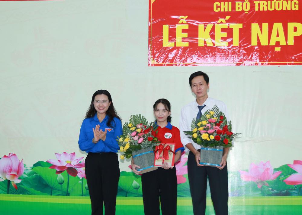 Đồng chí Nguyễn Phạm Duy Trang - Bí thư T.Ư Đoàn, Chủ tịch Hội đồng Đội T.Ư tặng hoa chúc mừng 02 đảng viên mới được kết nạp, trong đó có nữ sinh lớp 12. Ảnh: TPO