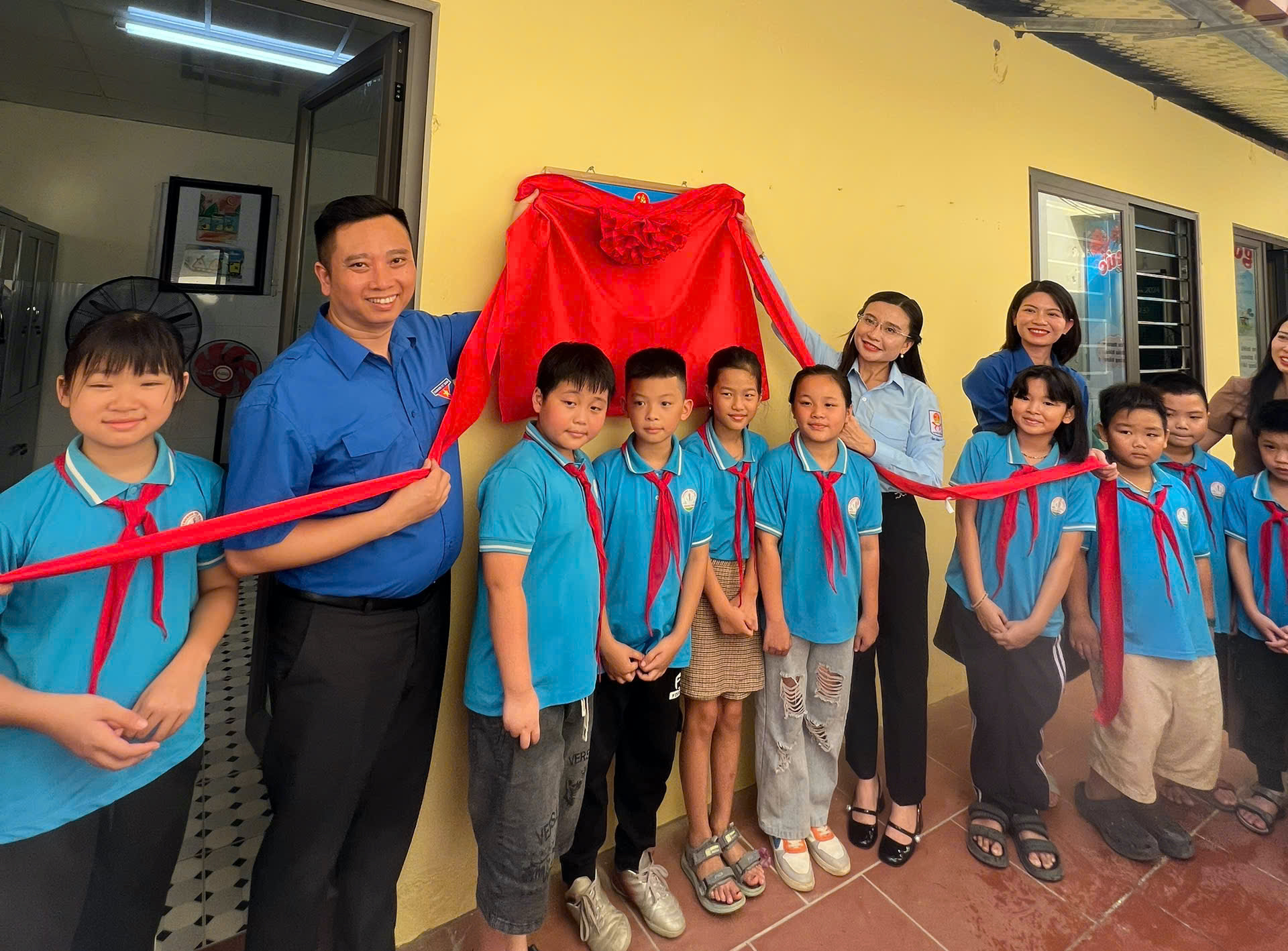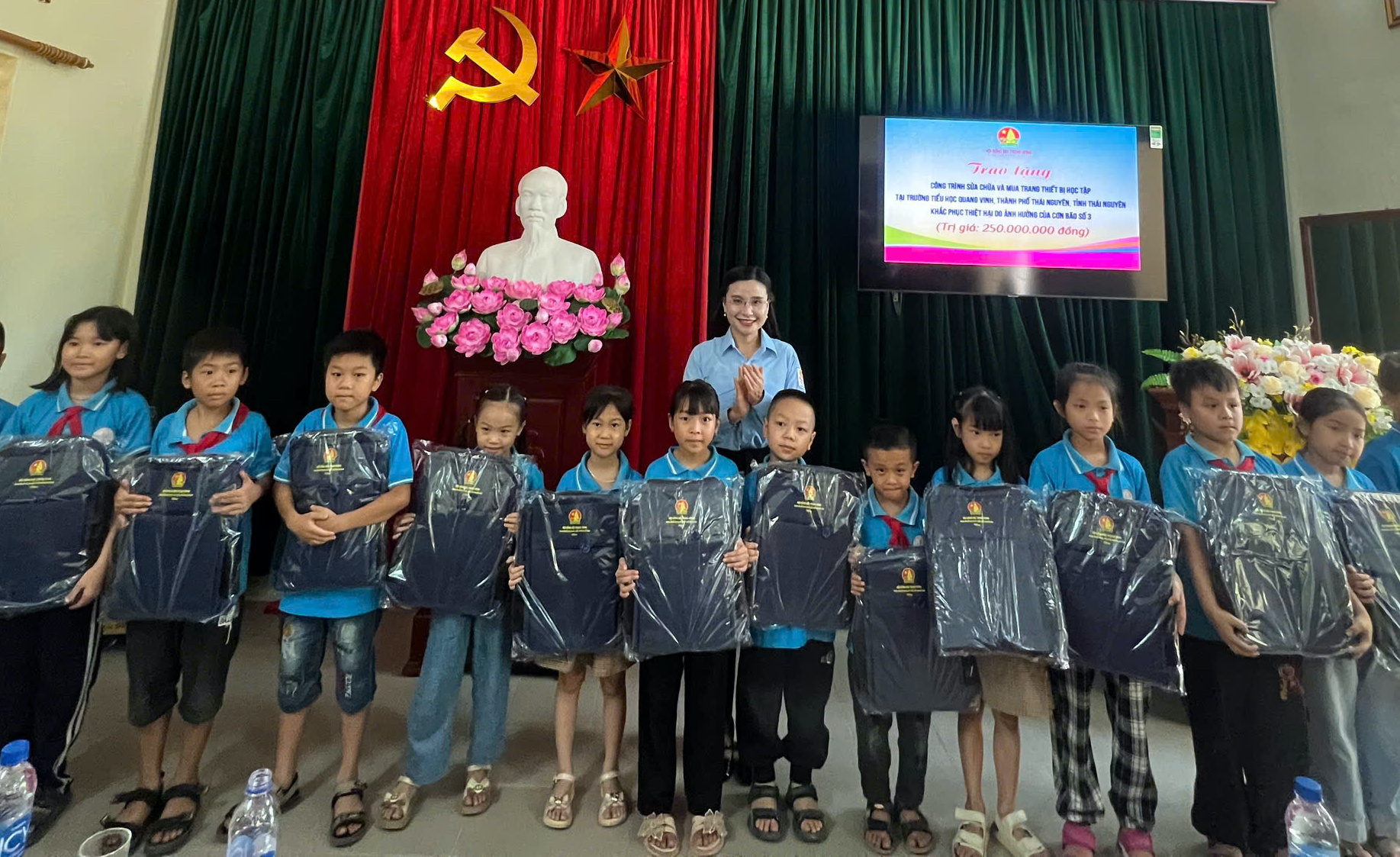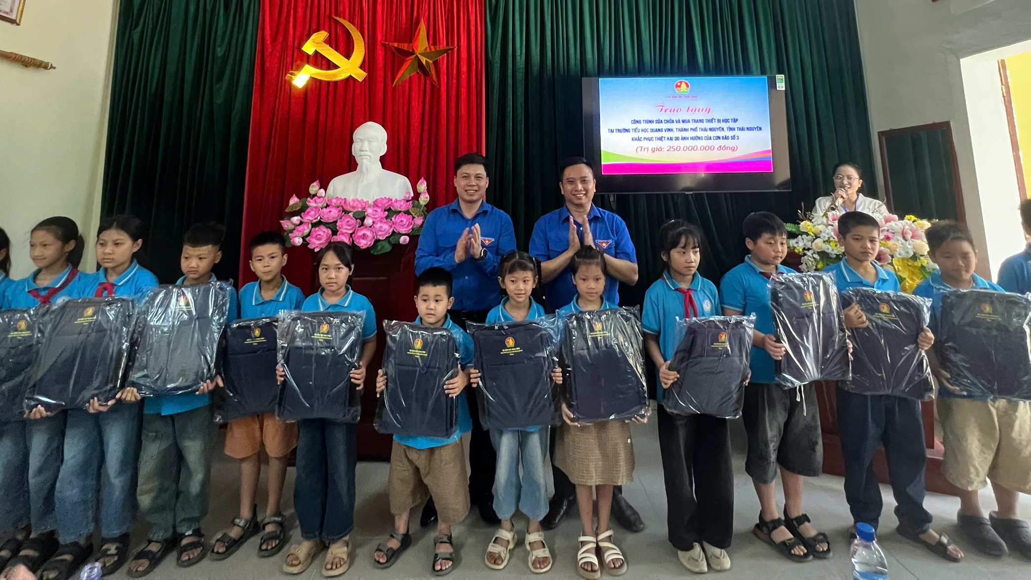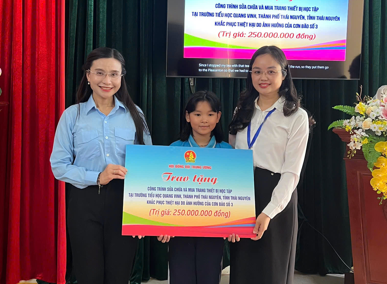 Đồng chí Nguyễn Phạm Duy Trang, Bí thư Trung ương Đoàn, Chủ tịch Hội đồng Đội Trung ương trao tặng 250 triệu đồng khánh thành, bàn giao công trình sửa chữa trường tiểu học Quang Vinh, thành phố Thái Nguyên do ảnh hưởng bão số 3.