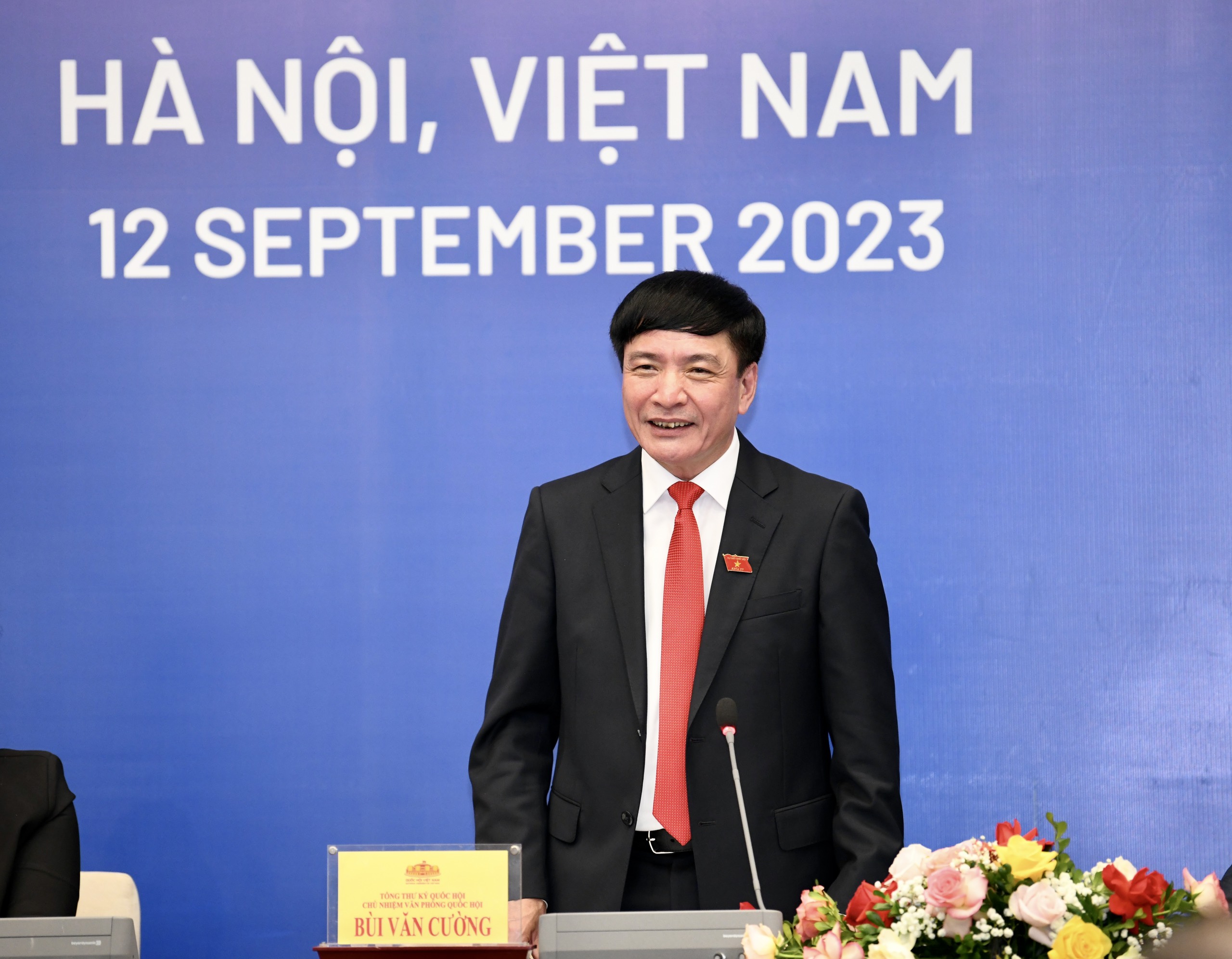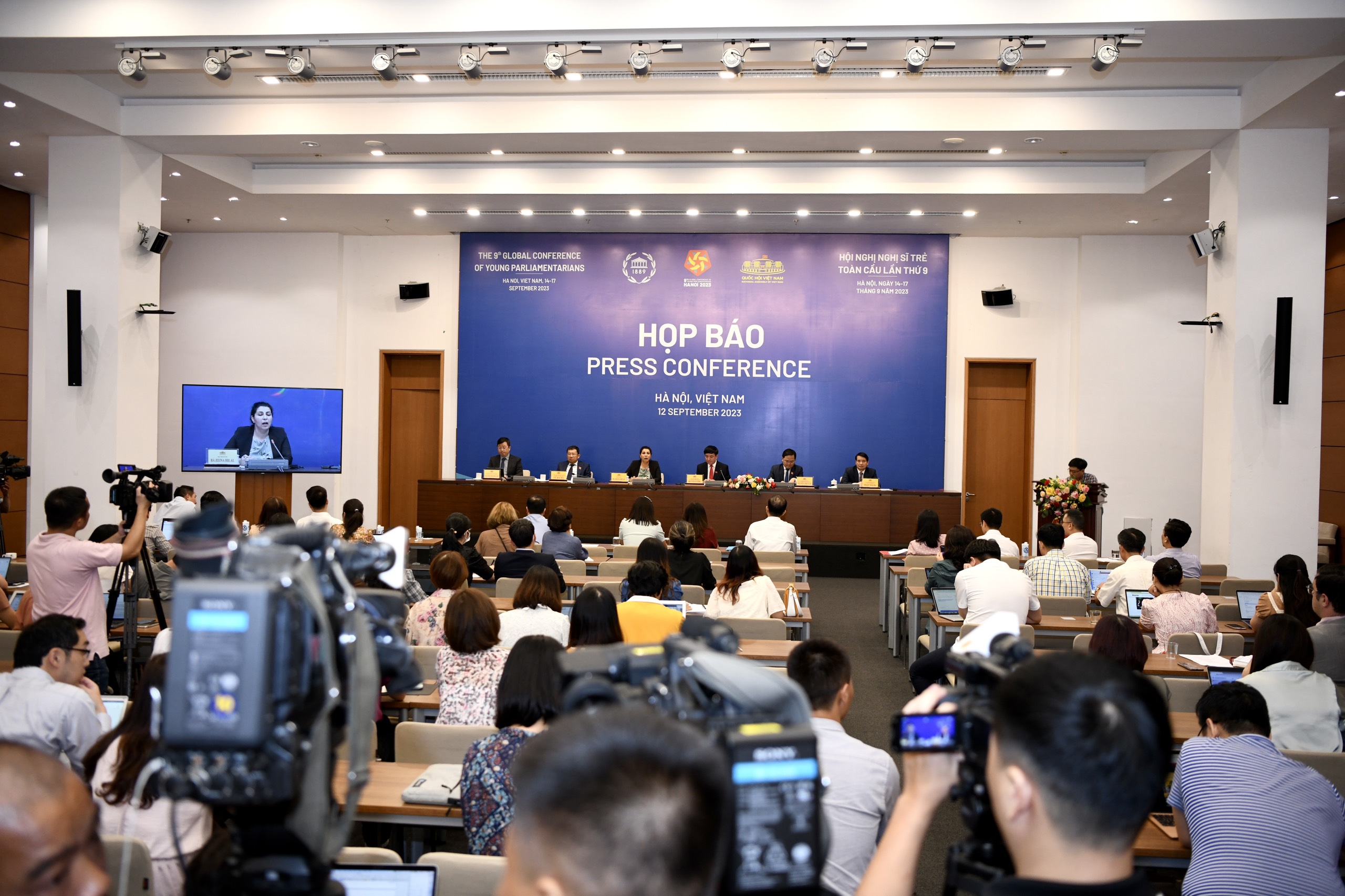 Chủ trì Họp báo có các đồng chí: Bùi Văn Cường- Uỷ viên T.Ư Đảng, Tổng Thư ký Quốc hội, Chủ nhiệm Văn phòng Quốc hội, Phó Trưởng Ban Tổ chức Hội nghị; Vũ Hải Hà- Uỷ viên T.Ư Đảng, Chủ nhiệm Ủy ban Đối ngoại, Phó Trưởng Ban Tổ chức Hội nghị; Nguyễn Anh Tuấn - Uỷ viên T.Ư Đảng, Chủ tịch Nhóm đại biểu Quốc hội trẻ Quốc hội khóa XV, Phó Trưởng Ban Tổ chức Hội nghị; Nguyễn Thanh Lâm - Thứ trưởng Bộ Thông tin và Truyền thông, Phó Trưởng Ban Tổ chức Hội nghị; Phạm Thái Hà - Phó Chủ nhiệm Văn phòng Quốc hội, Trợ lý Chủ tịch Quốc hội, Trưởng Tiểu ban Thông tin - Tuyên truyền; bà Zeina Hilal, cán bộ Ban Thư ký Liên minh Nghị viện Thế giới (IPU).