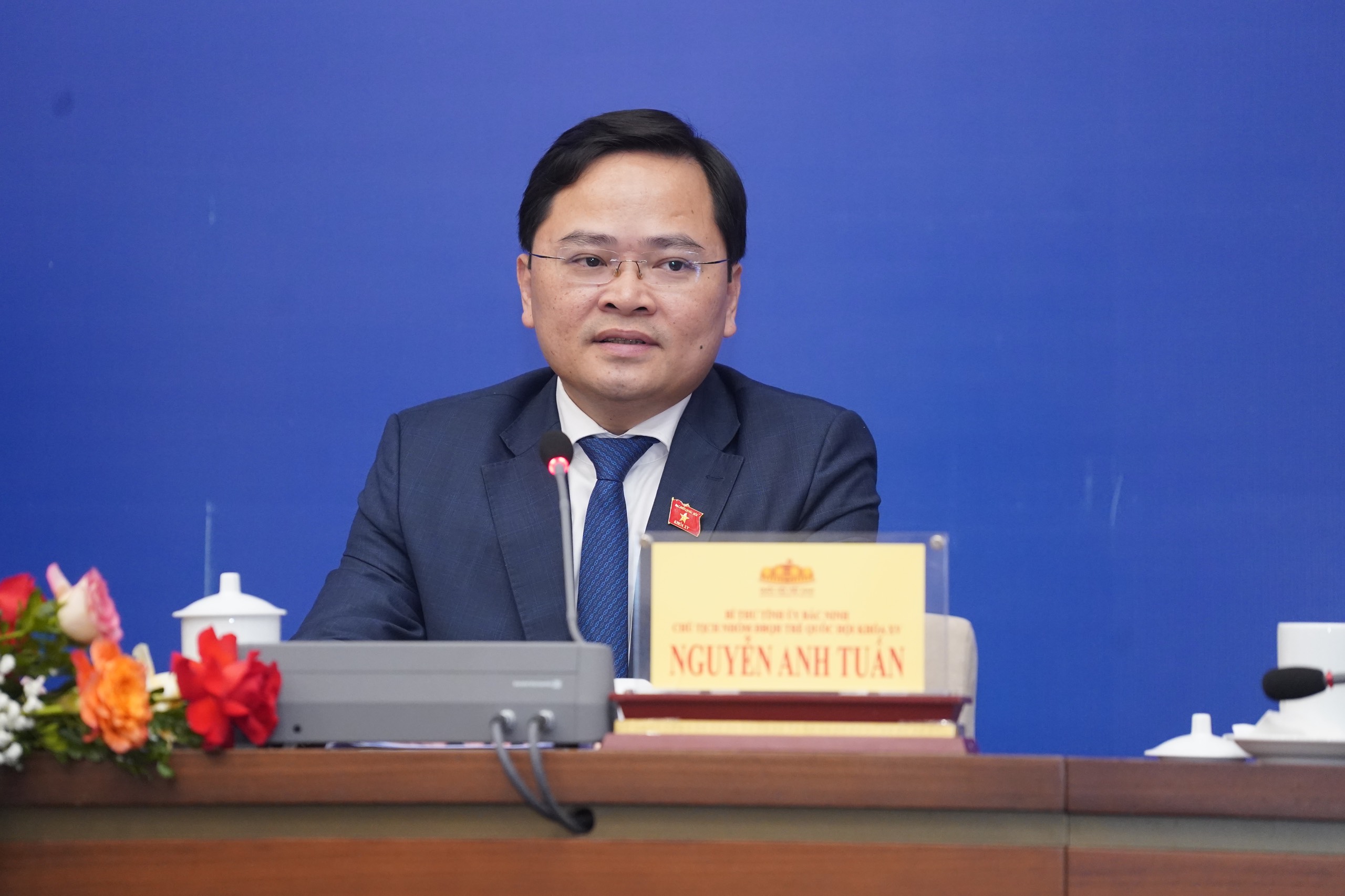 Chủ tịch Nhóm đại biểu Quốc hội trẻ Quốc hội khoá XV Nguyễn Anh Tuấn, Phó Trưởng Ban Tổ chức Hội nghị trao đổi thông tin tại Họp báo