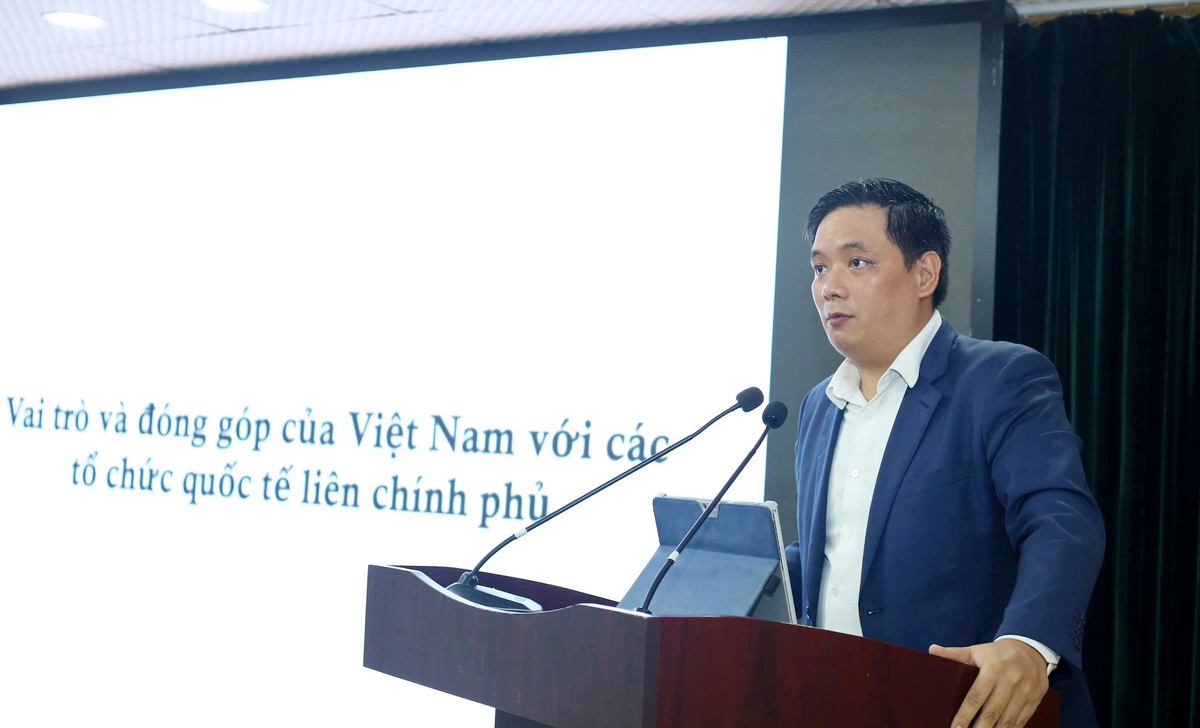 Đồng chí Nguyễn Vũ Minh, Phó Vụ trưởng Vụ các Tổ chức quốc tế, Bộ Ngoại giao trao đổi chuyên đề: “Vai trò và những đóng góp của Việt Nam tại các tổ chức quốc tế liên chính phủ”. Ảnh: Bảo Anh
