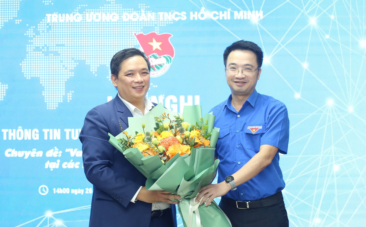 Bí thư T.Ư Đoàn Nguyễn Tường Lâm tặng hoa cảm ơn báo cáo viên. Ảnh: Bảo Anh