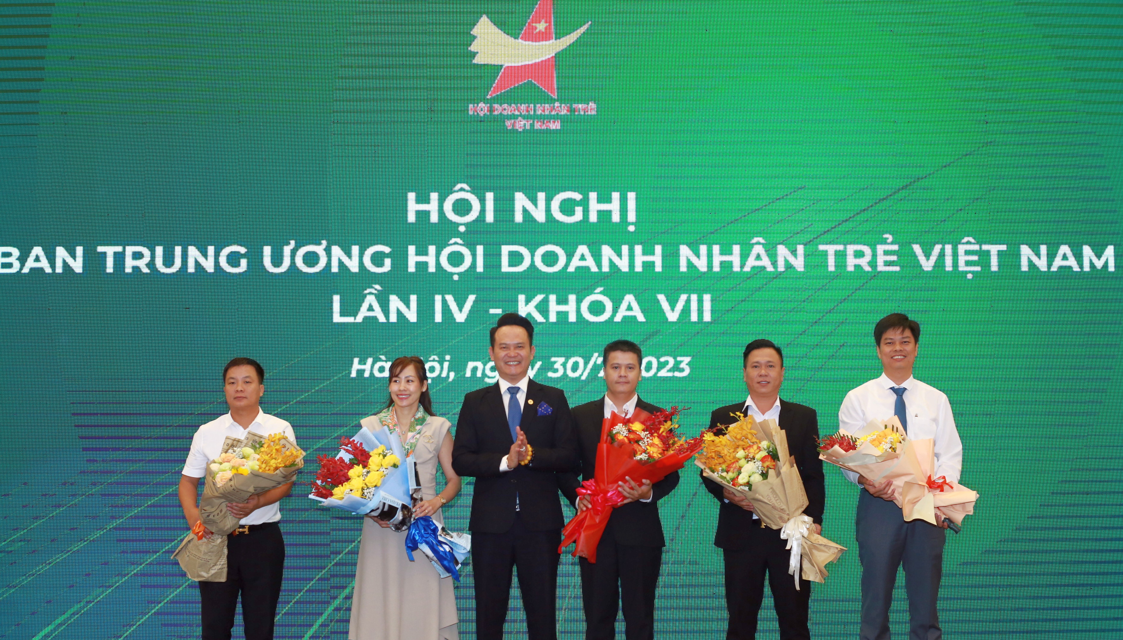 Đồng chí Đặng Hồng Anh tặng hoa các đồng chí được kiện toàn tham gia Ủy viên Ủy ban Trung ương Hội Doanh nhân trẻ Việt Nm