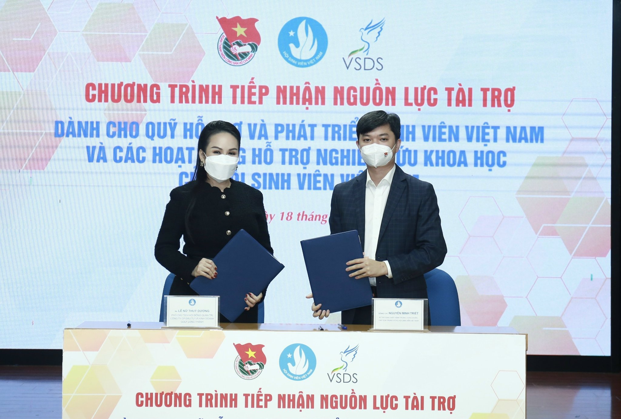 Bí thư Trung ương Đoàn, Chủ tịch Trung ương Hội Sinh viên Việt Nam Nguyễn Minh Triết ký kết tiếp nhận nguồn hỗ trợ từ bà Lê Nữ Thùy Dương, Phó Chủ tịch Hội đồng quản trị Công ty cổ phần Đầu tư và kinh doanh Golf Long Thành.