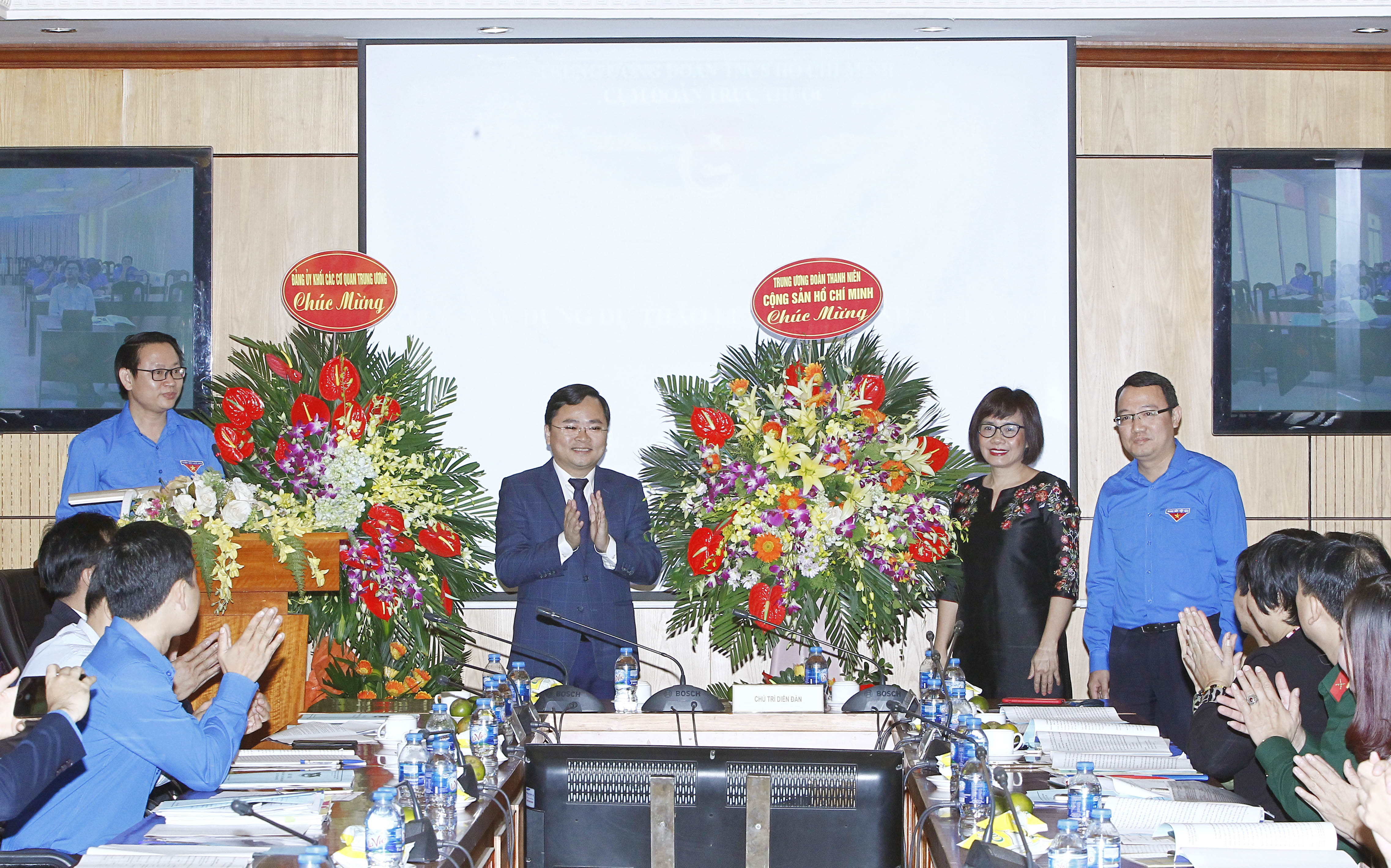 Bí thư Thường trực Trung ương Đoàn Nguyễn Anh Tuấn trao tặng lẵng hoa cho Thứ trưởng Bộ Tư pháp Đặng Hoàng Oanh nhân Ngày pháp luật Việt Nam