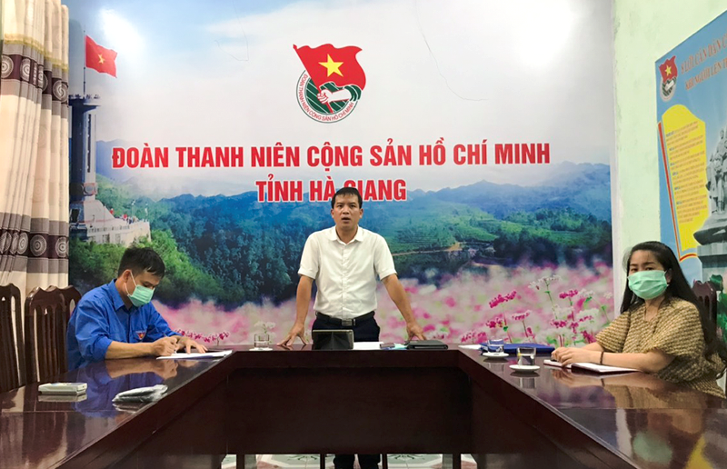 Đồng chí Thèn Văn Quân, Phó Bí thư Tỉnh đoàn, Chủ tịch Hội LHTN Việt Nam tỉnh Hà Giang phát biểu tại điểm cầu Tỉnh đoàn