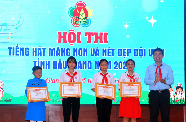 Dịp này, Ban Tổ chức Hội thi đã trao giải Nhất phần thi “Tiếng hát măng non” cho tập thể Hội đồng Đội huyện Châu Thành A; giải Nhất phần thi “Nét đẹp đội viên” cho em Nguyễn Hoàng Quân, Liên đội trường THCS Ngô Quốc Trị, huyện Vị Thủy và em Võ Phan Xuân Mai, Liên đội trường THCS Lê Quý Đôn, thành phố Vị Thanh. Bên cạnh đó, Ban Tổ chức đã trao giải của Cuộc thi vẽ tranh chào mừng Đại hội Cháu ngoan Bác Hồ tỉnh Hậu Giang lần thứ V - năm 2025 và Hội thi trưng bày sản phẩm. Theo đó, giải Nhất Cuộc thi vẽ tranh thuộc về em Ngô Mai Khanh, lớp 6A3, Liên đội THCS Thuận An, thị xã Long Mỹ; giải Nhất Hội thi trưng bày sản phẩm thuộc về tập thể Hội đồng Đội huyện Phụng Hiệp.
