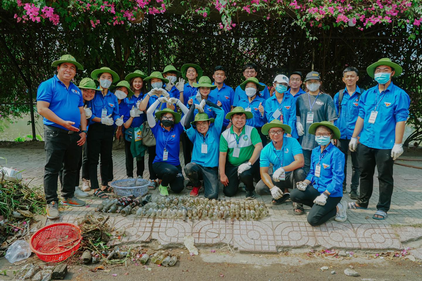 Một nhóm sinh viên nam dùng bồ cào kéo rác, cỏ và lục bình từ dưới dòng nước đen ngòm lên bờ, sau đó các bạn nữ dùng liềm cắt nhỏ ra dồn vào sọt hoặc buộc lại thành những bó lớn để đổ lên xe ép rác.