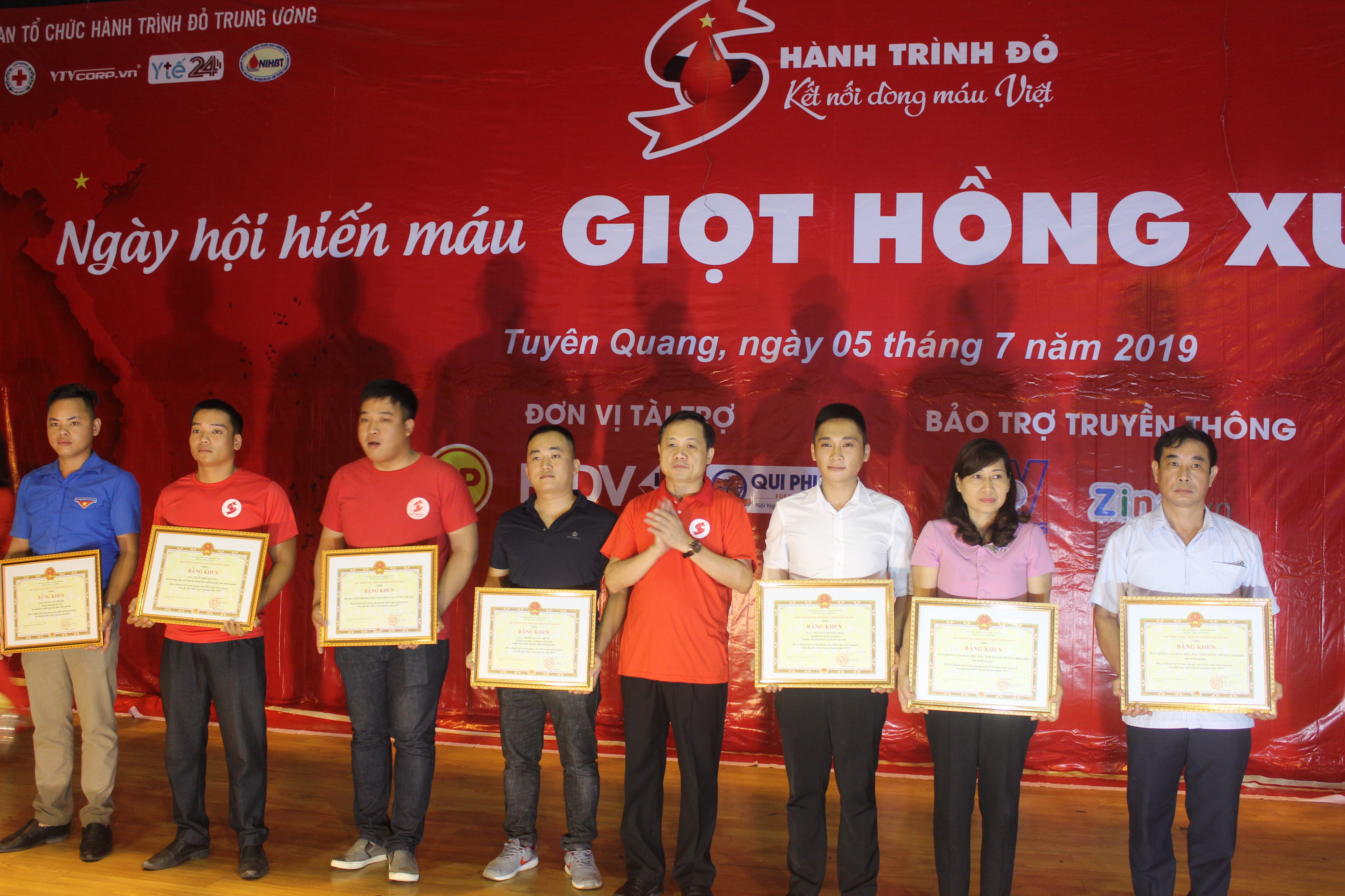 Nhân dịp này, Ban Tổ chức chương trình đã trao tặng bằng khen của Chủ tịch UBND tỉnh cho 04 tập thể và 05 cá nhân; Hội Chữ thập Đỏ tỉnh tặng giấy khen cho 03 tập thể và 14 cá nhân đã có thành tích xuất sắc trong phong trào hiến máu tình nguyện tỉnh Tuyên Quang năm năm 2019.