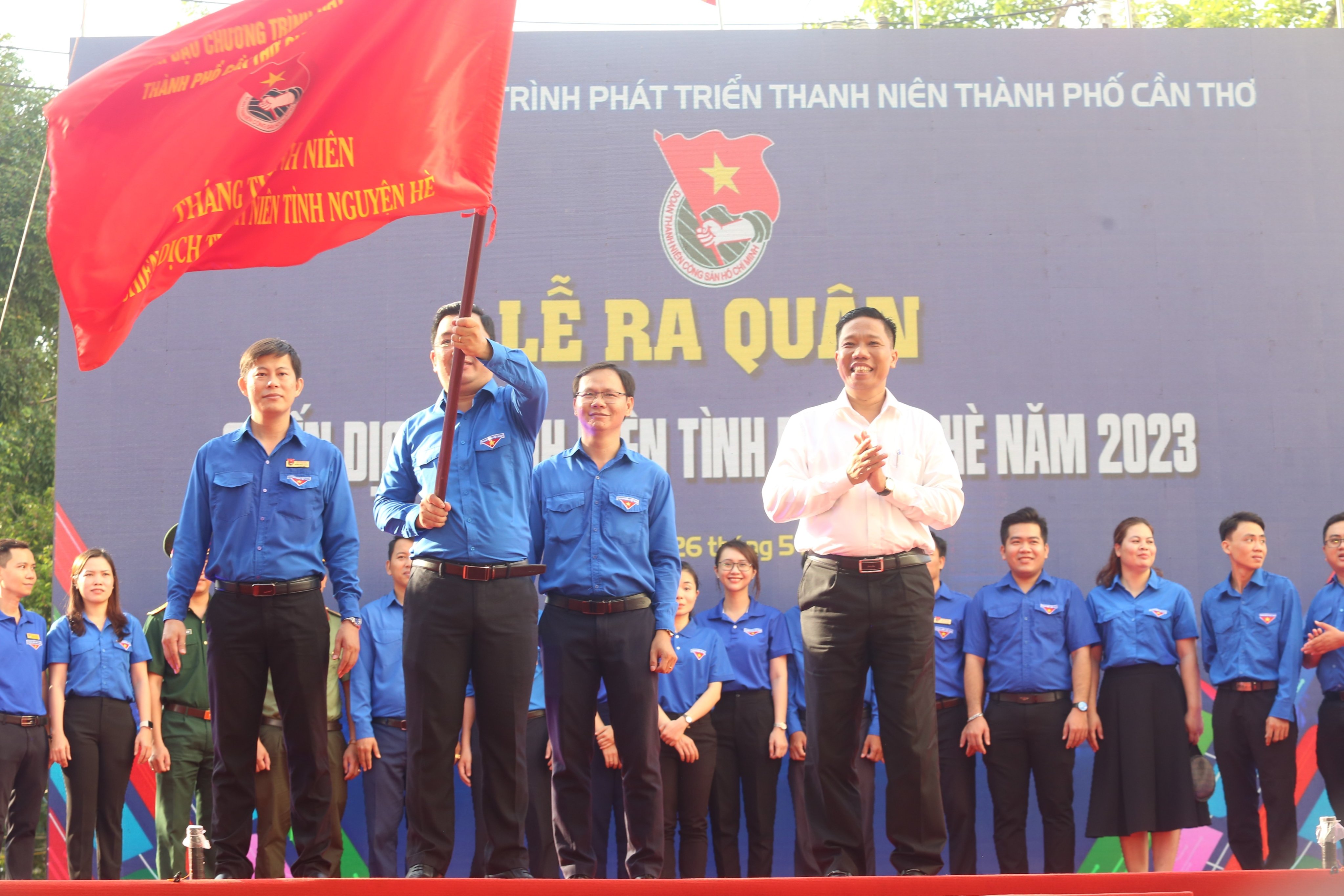 Đồng chí Nguyễn Thực Hiện, Thành ủy viên, Phó Chủ tịch UBND, Trưởng Ban Chỉ đạo Chương trình phát triển thanh niên thành phố Cần Thơ giai đoạn 2021 – 2030 trao cờ lệnh cho Ban Chỉ huy Chiến dịch thanh niên tình nguyện hè năm 2023.