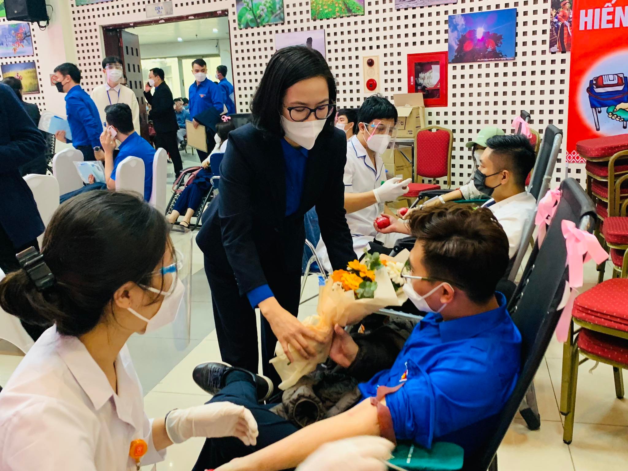 Đồng chí Hoàng Thị Minh Thu, Uỷ viên BTV Trung ương Đoàn, Uỷ viên BCH Đảng bộ Khối, Bí thư Đoàn Khối Doanh nghiệp Trung ương tặng hoa cho đoàn viên thanh niên tham gia hiến máu tình nguyện