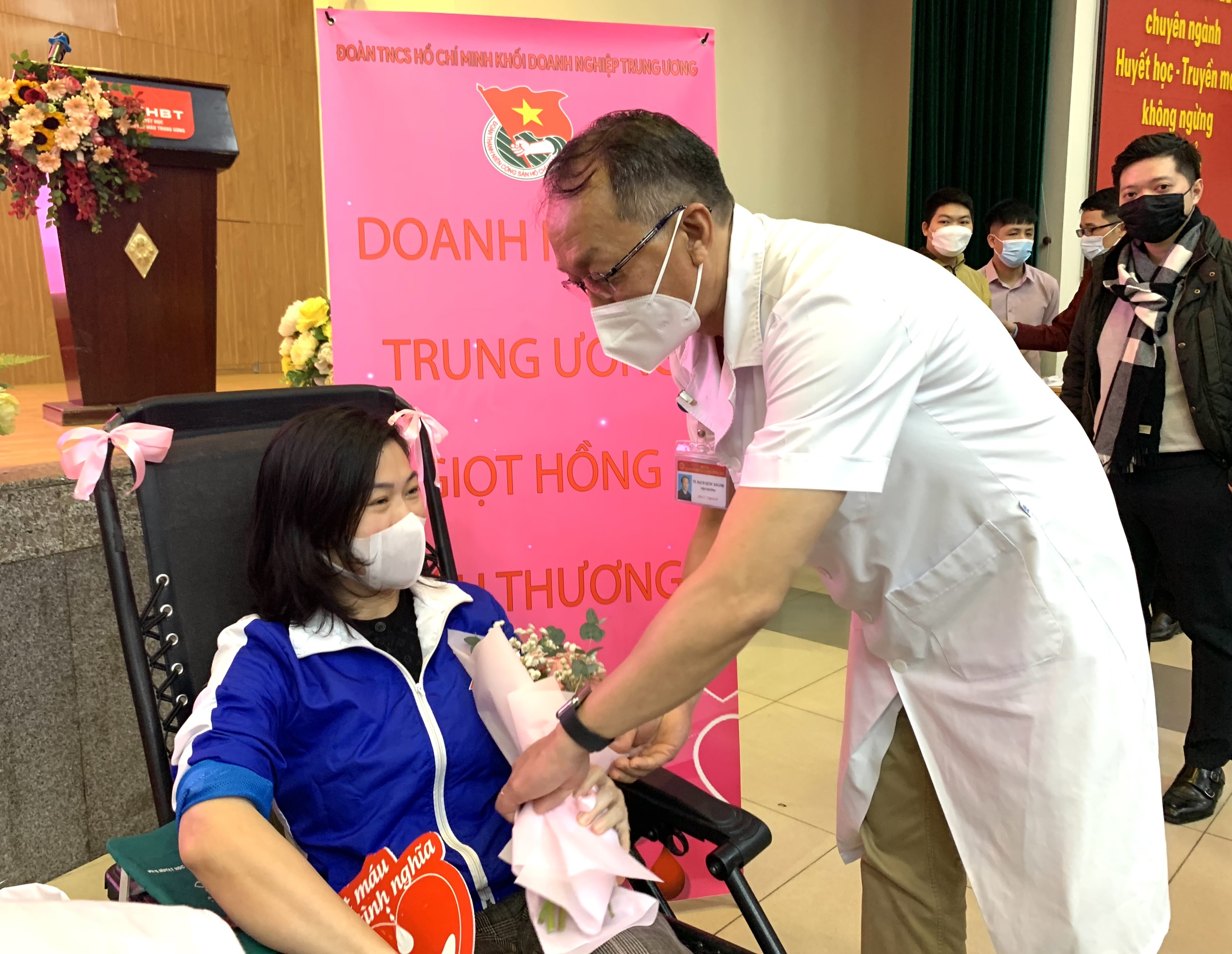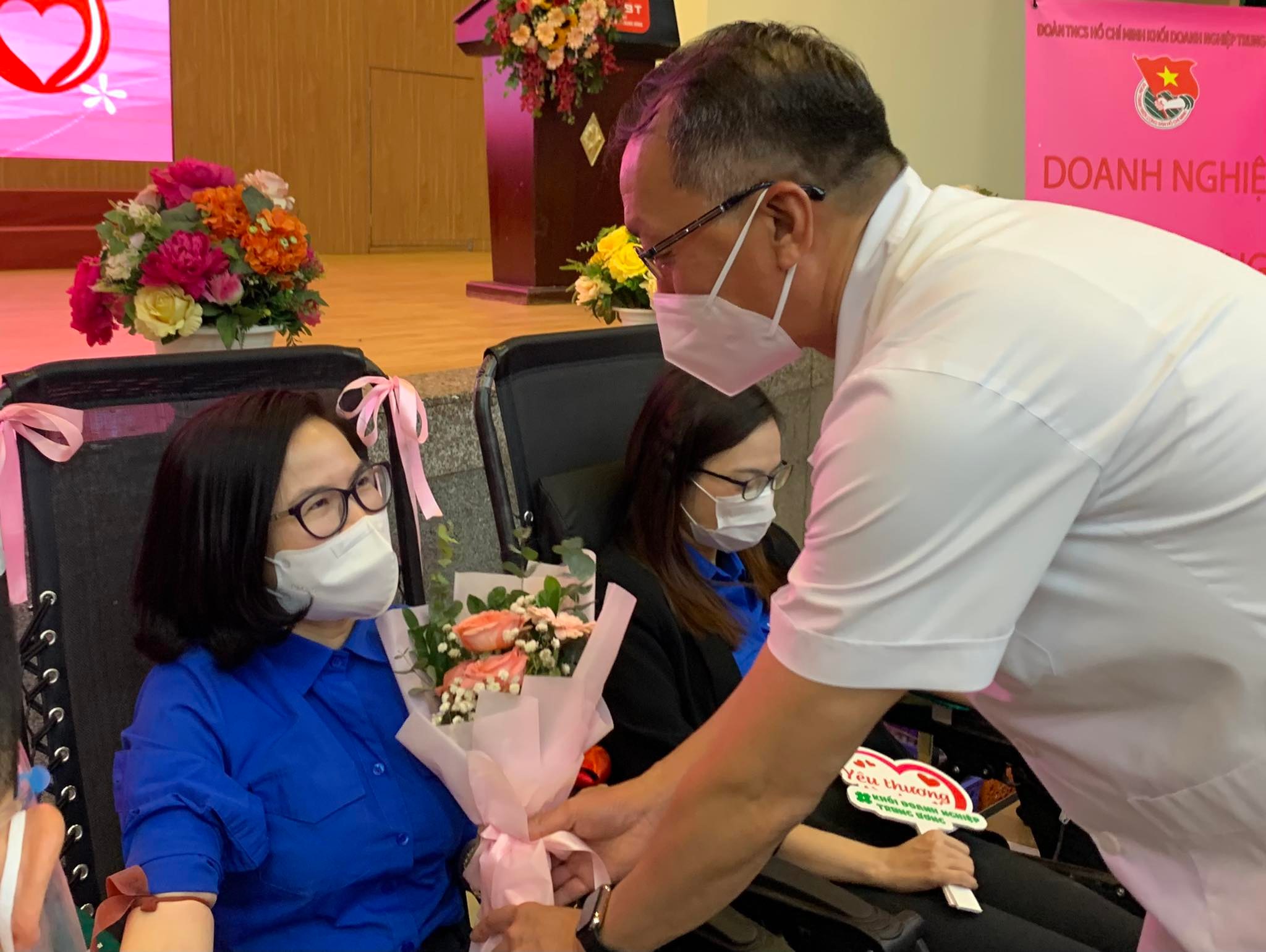 Viện trưởng Viện Huyết học – Truyền máu Trung ương Bạch Quốc Khánh tặng hoa cho Bí thư Đoàn khối Doanh nghiệp Trung ương Hoàng Thị Minh Thu tham gia hiến máu tình nguyện