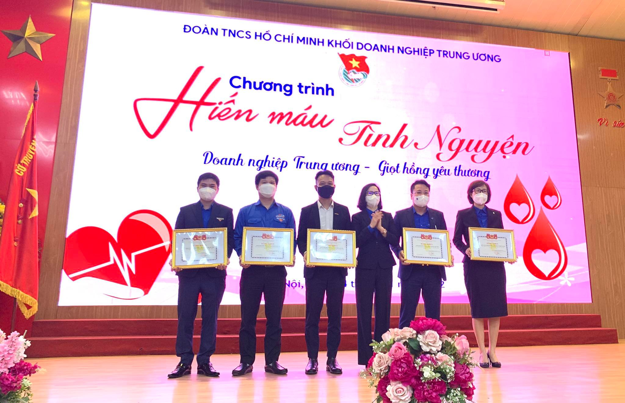 Đồng chí Hoàng Thị Minh Thu- Bí thư Đoàn Khối Doanh nghiệp Trung ương tặng Bằng khen cho 05 tập thể có nhiều đóng góp trong phong trào hiến máu tình nguyện
