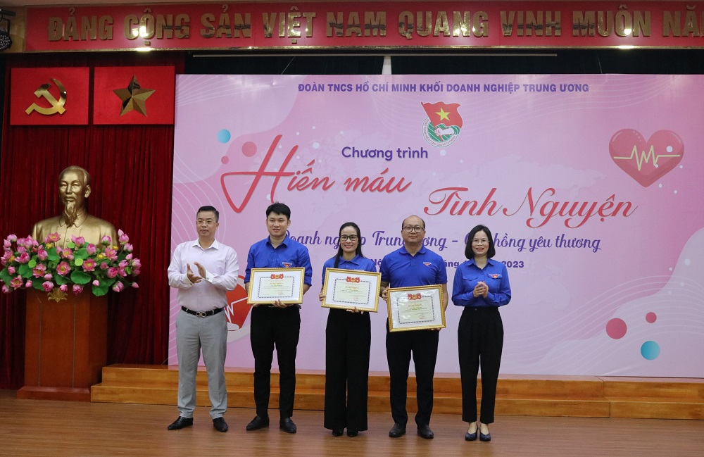 Đồng chí Nguyễn Trung Hiếu - Uỷ viên BTV, Trưởng Ban Tuyên giáo Đảng uỷ Khối và đồng chí Hoàng Thị Minh Thu- Uỷ viên BTV T.Ư Đoàn, Uỷ viên BCH Đảng bộ Khối, Bí thư Đoàn Khối Doanh nghiệp Trung ương tặng Bằng khen của Ban Thường vụ Đoàn Khối cho 03 tập thể có thành tích xuất sắc trong phong trào hiến máu tình nguyện năm 2023.