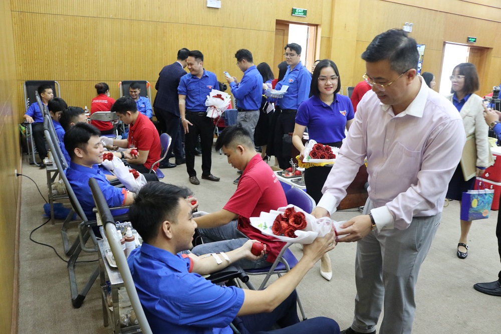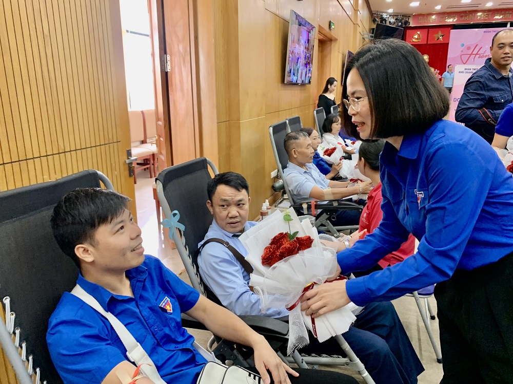 Trưởng Ban Tuyên giáo Đảng uỷ Khối Nguyễn Trung Hiếu tặng hoa cho đoàn viên thanh niên tham gia hiến máu tình nguyện