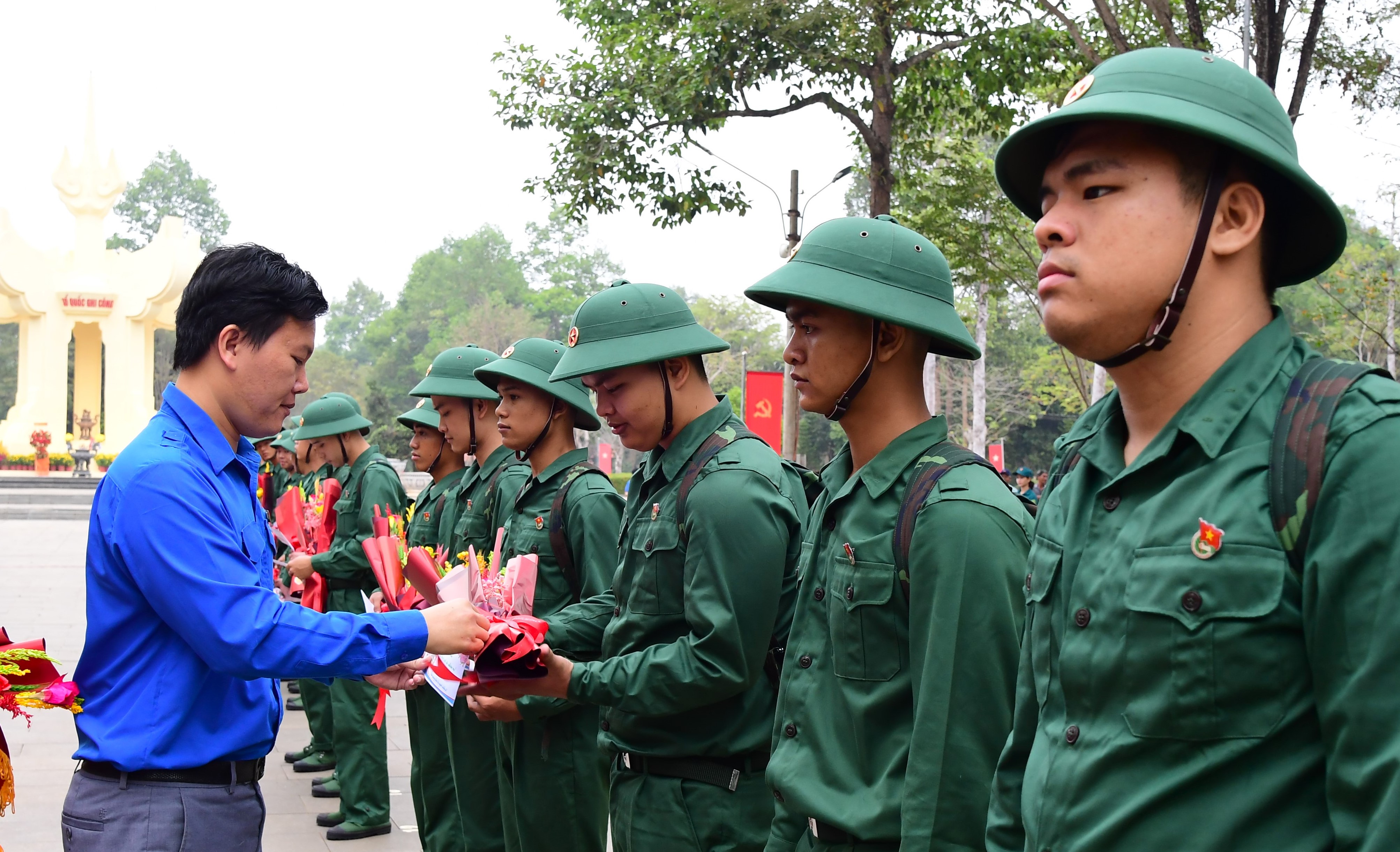 Đồng chí Trần Hoàng Trực, Tỉnh ủy viên, Bí thư Tỉnh đoàn trao hoa, động viên thanh niên huyện Lộc Ninh lên đường nhập ngũ