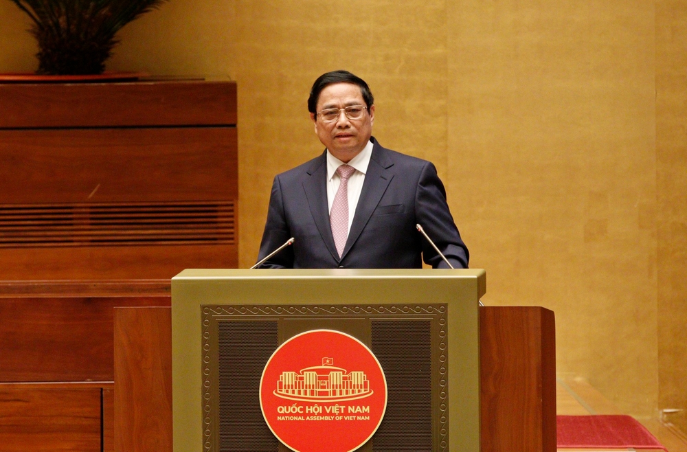 Đồng chí Phạm Minh Chính, Ủy viên Bộ Chính trị, Thủ tướng Chính phủ truyền đạt chuyên đề: "Tiếp tục đổi mới, nâng cao chất lượng chính sách xã hội, đáp ứng yêu cầu sự nghiệp xây dựng và bảo vệ Tổ quốc trong giai đoạn mới". Ảnh: Phạm Cường