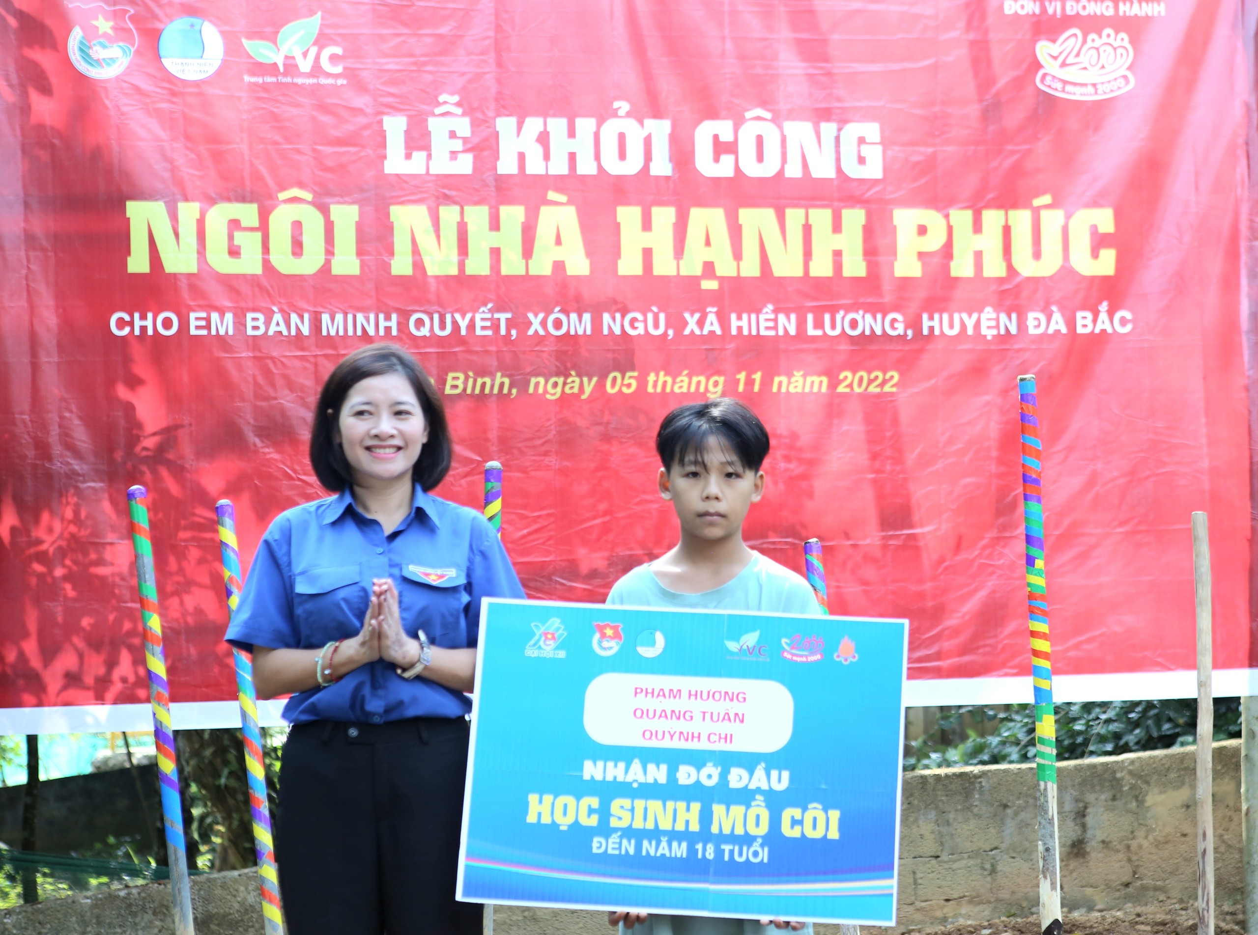 Giám đốc Trung tâm Tình nguyện Quốc gia Đỗ Thị Kim Hoa trao biển tượng trưng hỗ trợ xây dựng 02 công trình Ngôi Nhà hạnh phúc cho 02 em học sinh mồ côi, có hoàn cảnh đặc biệt khó khăn vươn lên trong học tập.