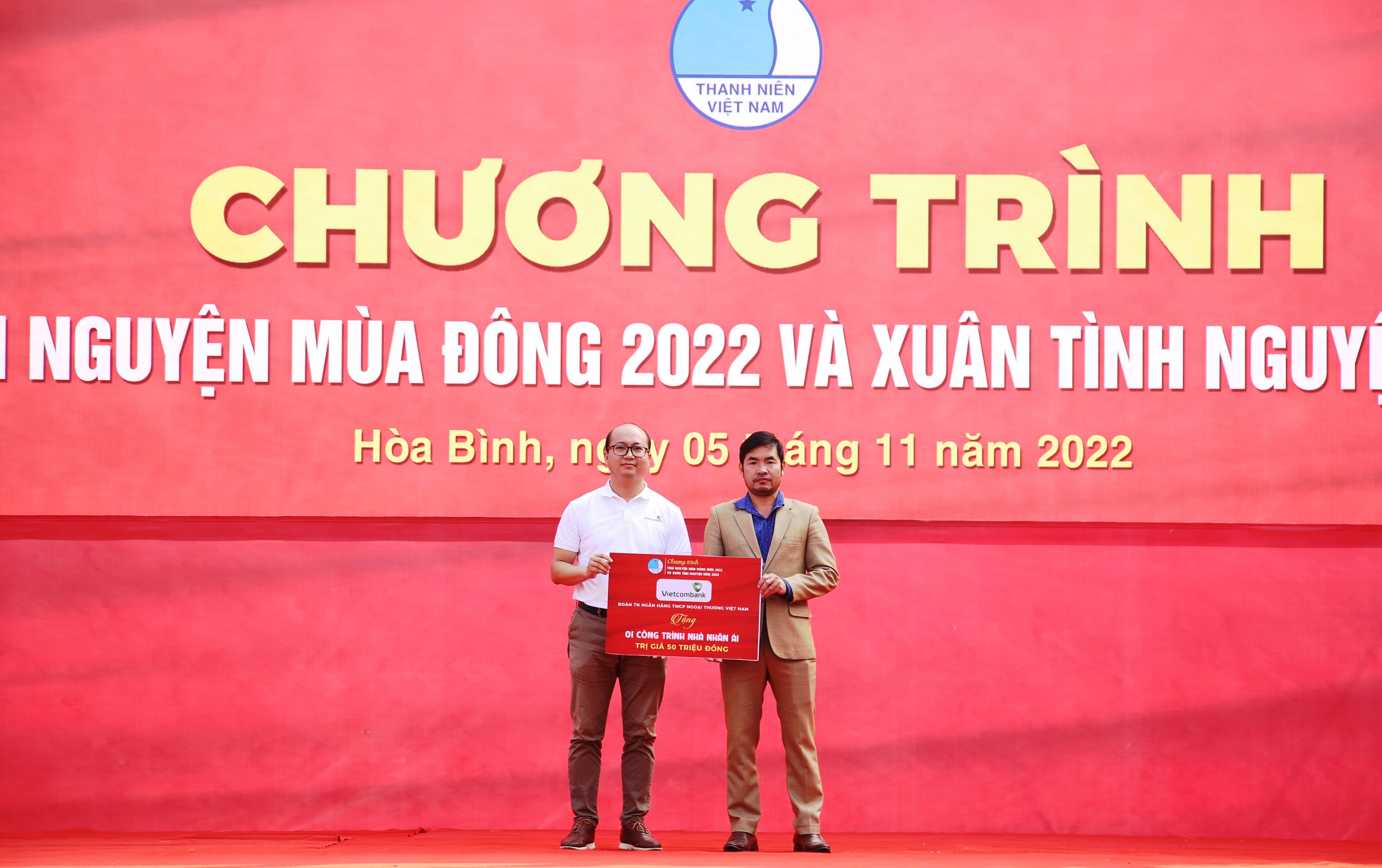 Đồng chí Dương Bảo Trung - Bí thư Đoàn Thanh niên Ngân hàng TMCP Ngoại thương Việt Nam trao biển hỗ trợ kinh phí xây dựng công trình Nhà nhân ái cho gia đình bà Xa Thị Hộn, Xóm Đắt 3, xã Giáp Đắt, huyện Đà Bắc, tỉnh Hòa Bình có hoàn cảnh khó khăn trị giá 50 triệu đồng.