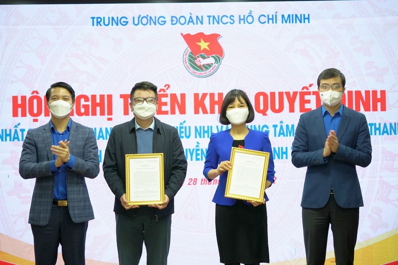 Đồng chí Bùi Quang Huy - Bí thư thường trực Trung ương Đoàn và đồng chí Nguyễn Ngọc Lương - Bí thư Trung ương Đoàn, Chủ tịch Hội LHTN Việt Nam trao quyết định cho đồng chí Lê Duy Hưng Thịnh và đồng chí Lê Thu Anh
