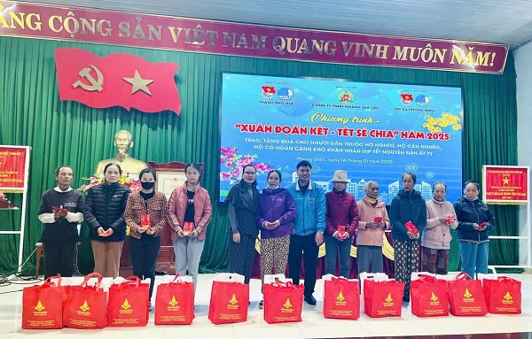 Phát huy vai trò xung kích, sáng tạo, tình nguyện của tuổi trẻ thành phố Huế trong tham gia phát triển kinh tế - xã hội, góp phần đảm bảo an sinh, đồng thời thể hiện vai trò, sự quan tâm của tổ chức Đoàn đối với các hoàn cảnh khó khăn trên địa bàn thành phố, với sự sẻ chia, đồng hành của Công ty TNHH Hoàng Gia Lộc, Ban Thường vụ Thành đoàn đã tổ chức thành công chuỗi Chương trình “Xuân đoàn kết - Tết sẻ chia” năm 2025 - Trao, tặng 250 suất quà với tổng trị giá 165.000.000đ cho người dân thuộc hộ nghèo, hộ cận nghèo, hộ có hoàn cảnh khó khăn nhân dịp Tết Nguyên đán Ất Tỵ trên địa bàn thành phố.