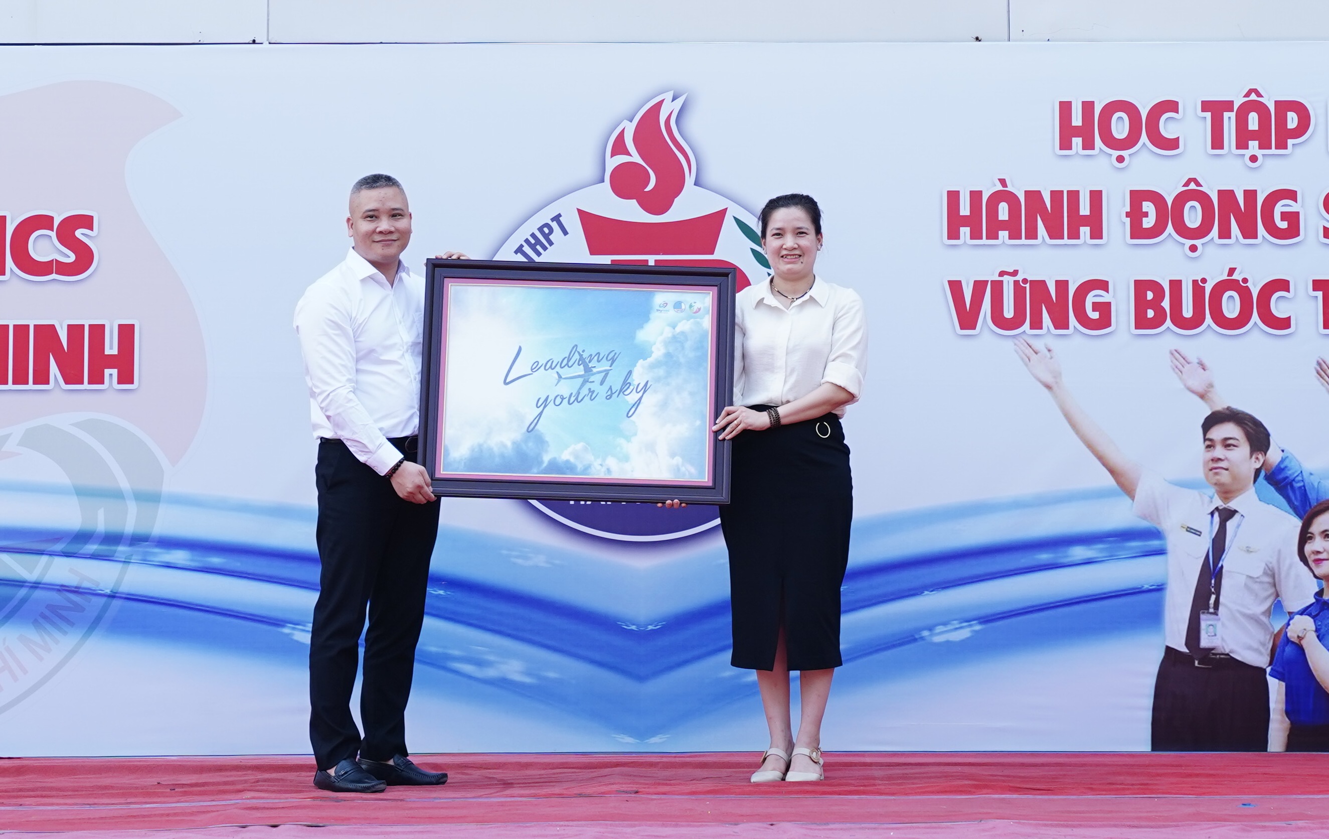 Anh Trần Linh Sơn - Giám đốc Trung tâm tư vấn LMF (Trung ương Hội LHTN Việt Nam) và chị Vương Toàn Thu Thuỷ - Phó Bí thư phụ trách Thành Đoàn Hải Phòng trao học bổng cho các bạn học sinh tại trường THPT Thái Phiên