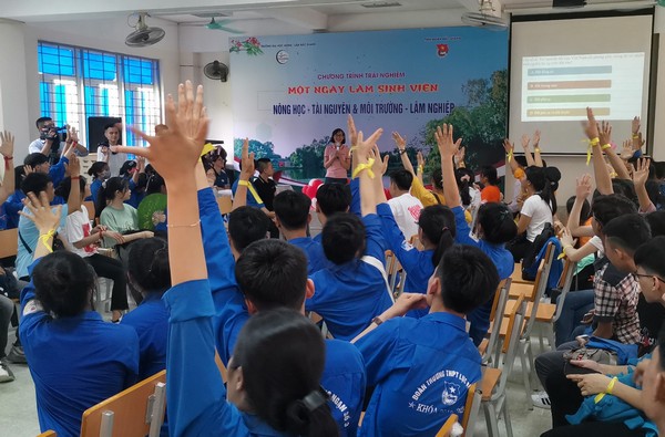 Sau đó, các em sẽ phân tổ để tham gia các hoạt động trải nghiệm theo ngành nghề như Chăn nuôi thú y – Công nghệ thực phẩm, Tài nguyên môi trường – Nông – Lâm nghiệp, Kinh tế tài chính – Tin học ngoại ngữ. Tại mỗi khu vực trải nghiệm các em được trực tiếp thực hành các sản phẩm nông nghiệp công nghệ cao, nuôi cấy mô, chế biến các sản phẩm tái chế, xây dựng kế hoạch đầu tư tài chính,… kết hợp tham gia các trò chơi vận động.Vào giờ nghỉ trưa, các em học sinh sẽ được trải nghiệm sinh hoạt cơm sinh viên, nghỉ ngơi tại ký túc xá của trường.