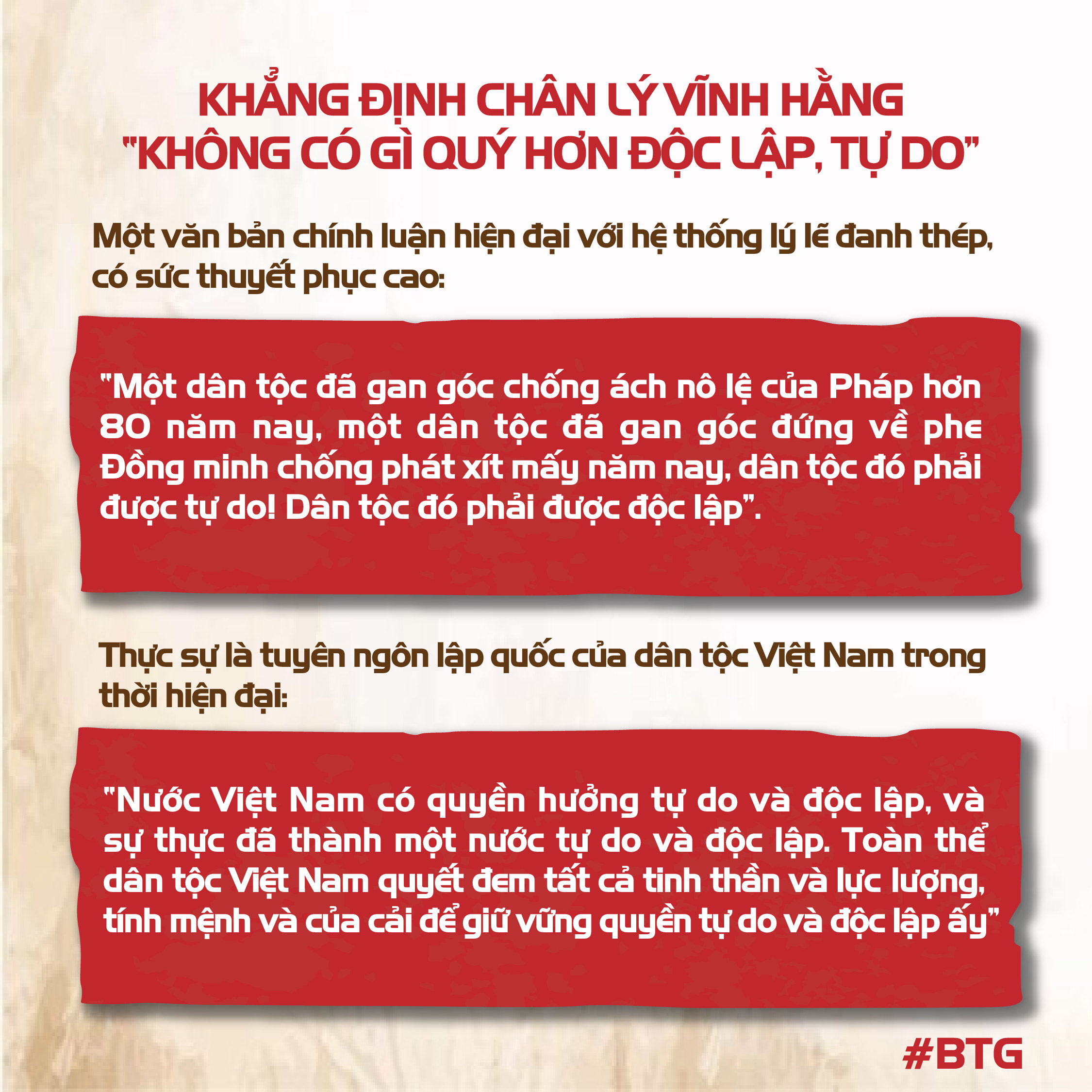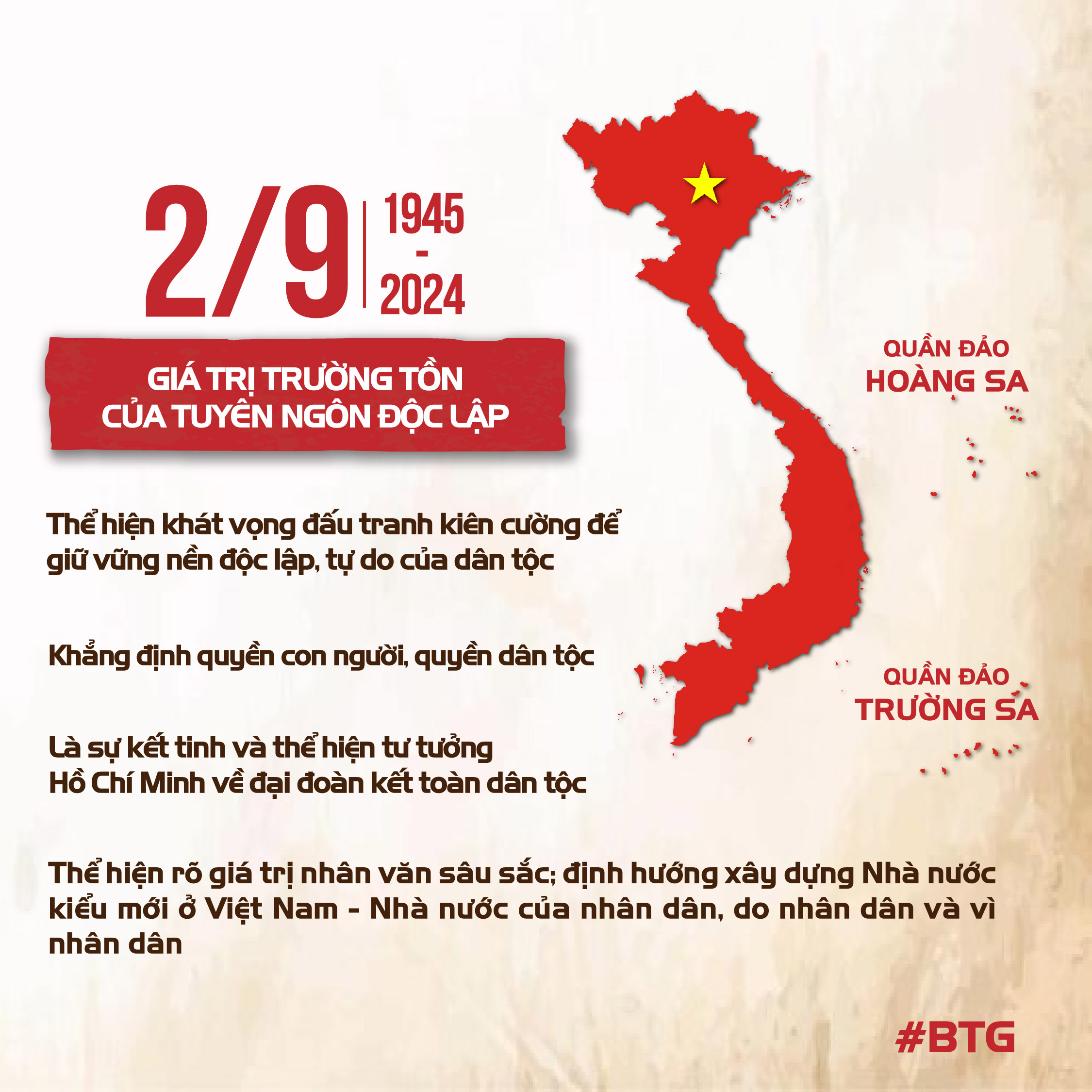 79 năm đã trôi qua, nhưng những quan điểm, tư tưởng của Chủ tịch Hồ Chí Minh thể hiện trong bản Tuyên ngôn Độc lập về quyền con người, quyền dân tộc và sự thống nhất biện chứng giữa quyền con người và quyền dân tộc, về khát vọng và tinh thần đấu tranh kiên cường để giữ vững nền độc lập, tự do, vẫn vẹn nguyên tính thời sự, có ý nghĩa đặc biệt sâu sắc.