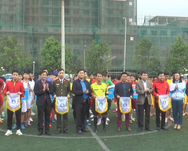 Các đồng chí lãnh đạo tỉnh, Tỉnh Đoàn tặng cờ lưu niệm tham dự giải cho các đội bóng