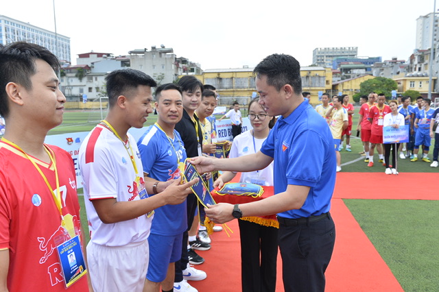 Anh Nguyễn Kim Quy, Ủy viên Ban Thường vụ Trung ương Đoàn, Phó Chủ tịch Thường trực Trung ương Hội LHTN Việt Nam tặng cờ lưu niệm và hoa cho các đội bóng tại lễ khai mạc