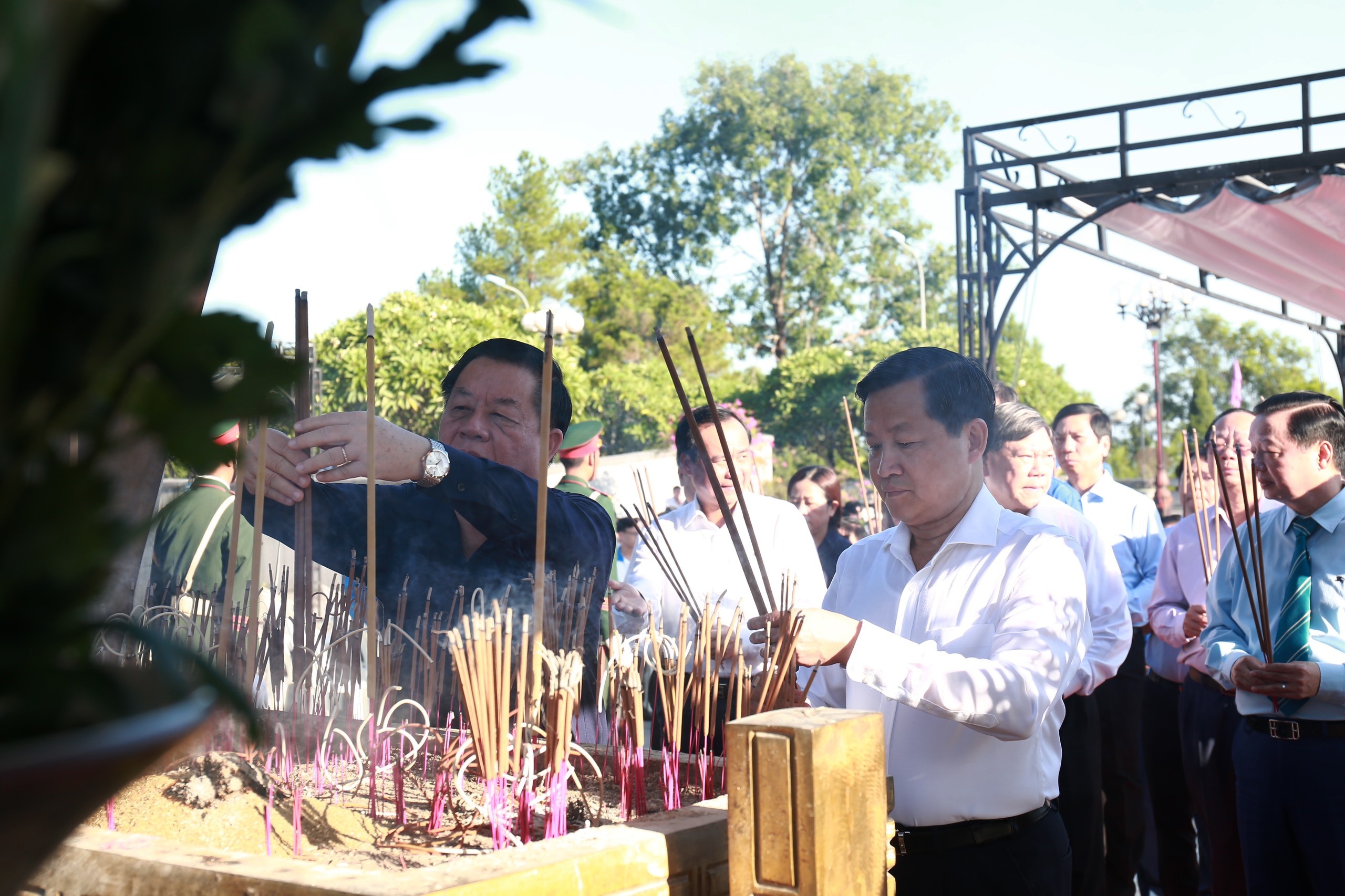 Đồng chí Nguyễn Trọng Nghĩa- Bí thư Trung ương Đảng, Trưởng Ban Tuyên giáo Trung ương và đồng chí Lê Minh Khái- Bí thư Trung ương Đảng, Phó Thủ tướng Chính phủ cùng các đồng chí lãnh đạo dâng hương tại Nghĩa trang liệt sỹ Quốc gia Đường 9