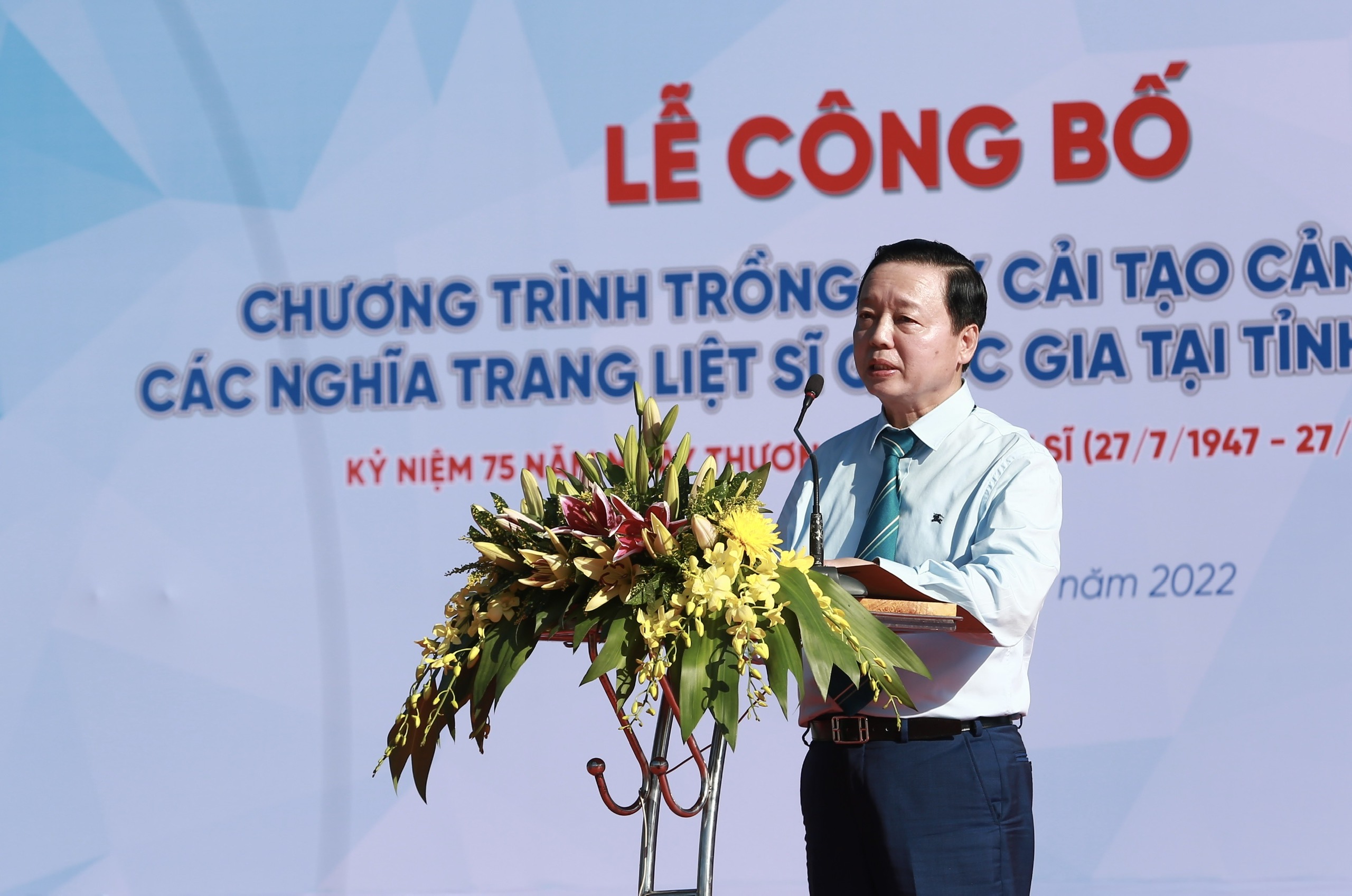 Bộ trưởng Bộ Tài nguyên và Môi trường Trần Hồng Hà phát biểu tại lễ công bố trồng cây xanh, cải tạo cảnh quan tại các di tích lịch sử, nghĩa trang liệt sĩ tỉnh Quảng Trị