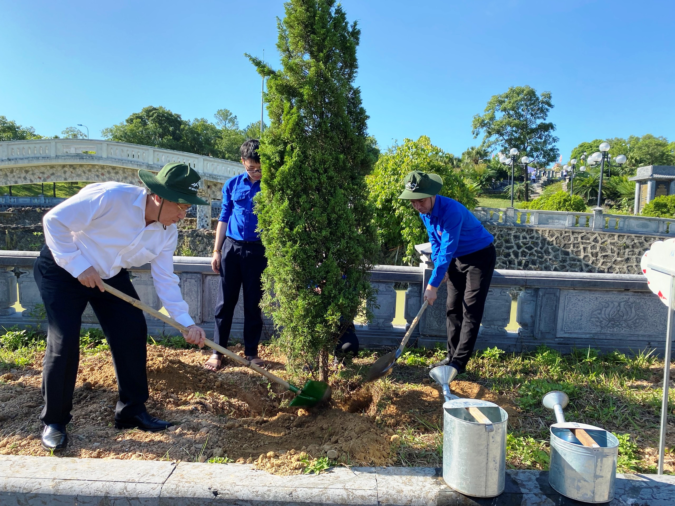 Các đồng chí lãnh đạo cùng các bạn ĐVTN tham gia trồng cây xanh tại Nghĩa trang liệt sỹ Quốc gia Trường Sơn