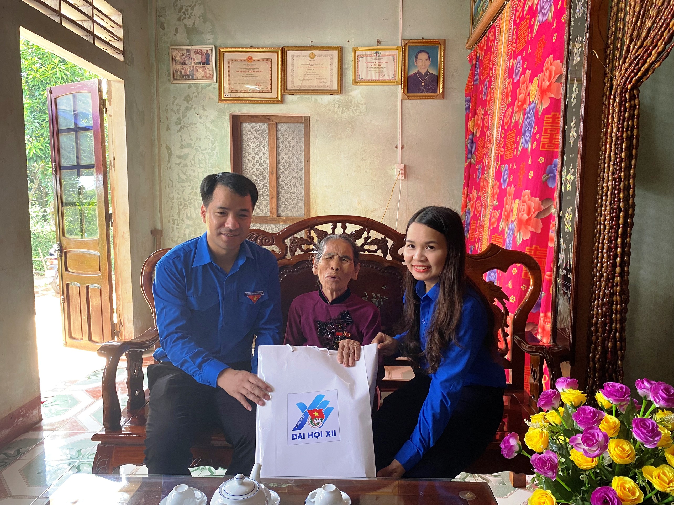 Đồng chí Ngô Văn Cương- Bí thư Trung ương Đoàn và Bí thư Tỉnh đoàn Quảng Trị Trần Thị Thu thăm hỏi, tặng quà Mẹ Việt Nam anh hùng Nguyễn Thị Nậy