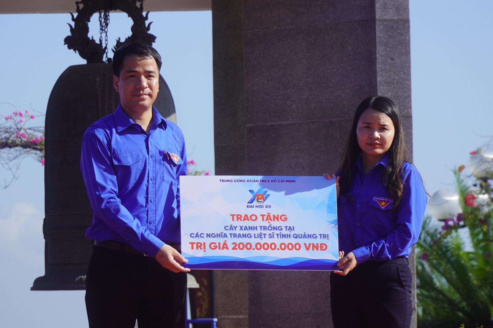 Đồng chí Ngô Văn Cương, Bí thư T.Ư Đoàn tặng biểu trưng tặng cây xanh tại các nghĩa trang Quảng Trị cho Tỉnh đoàn Quảng Trị. Ảnh: Nguyễn Phúc - TNO