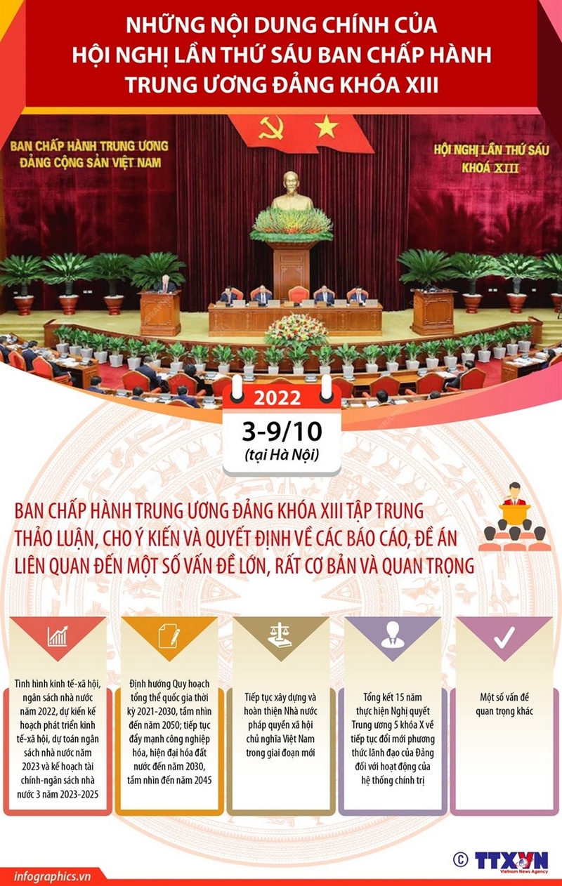 Tại Hội nghị, Ban Chấp hành Trung ương Đảng khóa XIII tập trung thảo luận, cho ý kiến và quyết định về các báo cáo, đề án liên quan đến một số vấn đề lớn, rất cơ bản và quan trọng: Về tình hình kinh tế-xã hội, ngân sách nhà nước năm 2022, dự kiến kế hoạch phát triển kinh tế-xã hội, dự toán ngân sách nhà nước năm 2023 và kế hoạch tài chính-ngân sách nhà nước 3 năm 2023-2025; định hướng Quy hoạch tổng thể quốc gia thời kỳ 2021-2030, tầm nhìn đến năm 2050; tiếp tục đẩy mạnh công nghiệp hóa, hiện đại hóa đất nước đến năm 2030, tầm nhìn đến năm 2045; tiếp tục xây dựng và hoàn thiện Nhà nước pháp quyền xã hội chủ nghĩa Việt Nam trong giai đoạn mới; tổng kết 15 năm thực hiện Nghị quyết Trung ương 5 khóa X về tiếp tục đổi mới phương thức lãnh đạo của Đảng đối với hoạt động của hệ thống chính trị và một số vấn đề quan trọng khác.