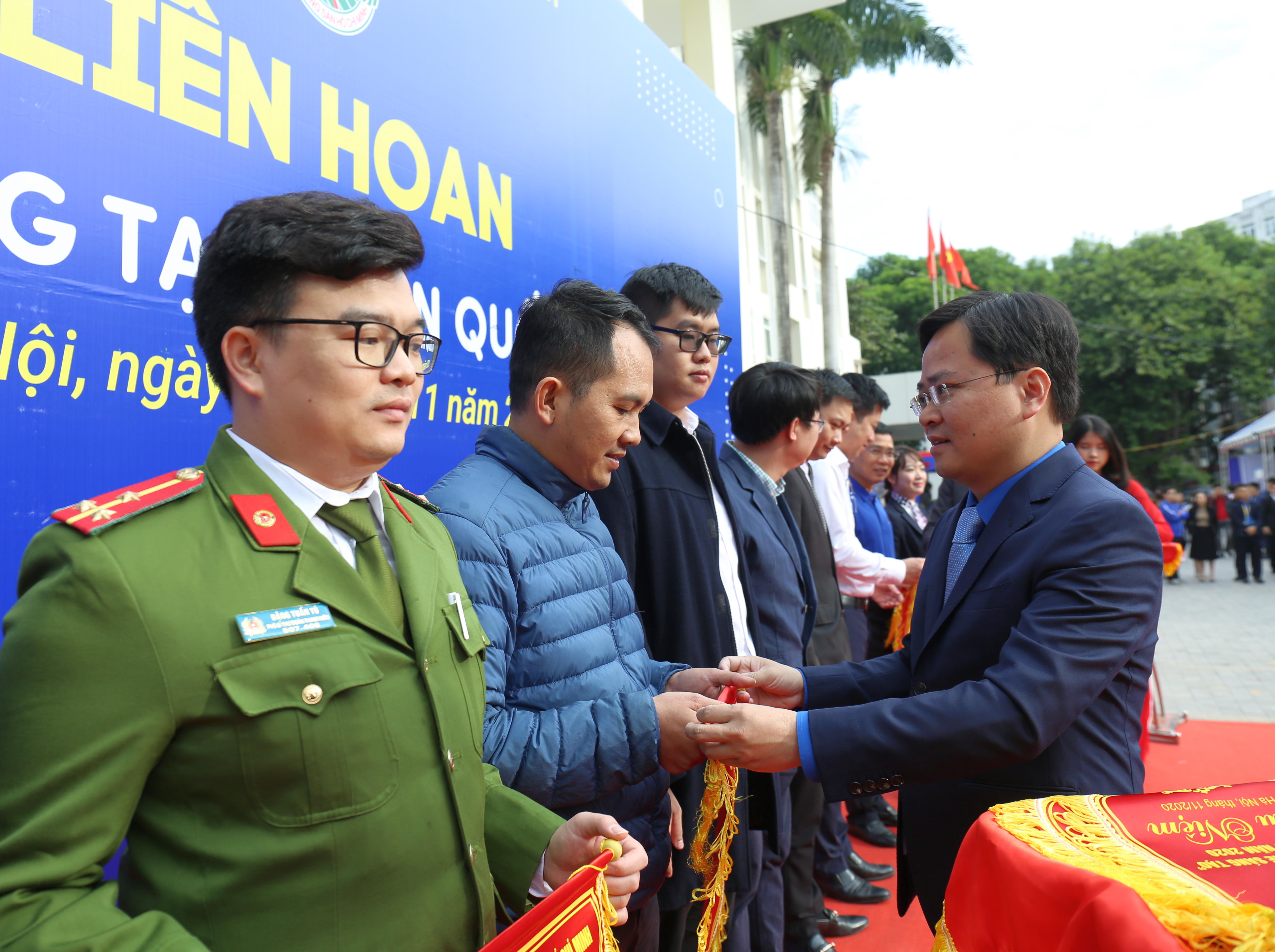 Đồng chí Nguyễn Anh Tuấn, Bí thư thứ nhất TƯ Đoàn trao cờ lưu niệm cho các đơn vị tại lễ khai mạc