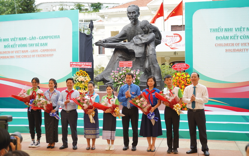 Đồng chí Ngô Văn Cương - Bí thư T.Ư Đoàn cùng các đồng chí lãnh đạo TP HCM tặng hoa chúc mừng đại diện các đoàn đại biểu thiếu nhi ba nước Việt Nam - Lào - Campuchia