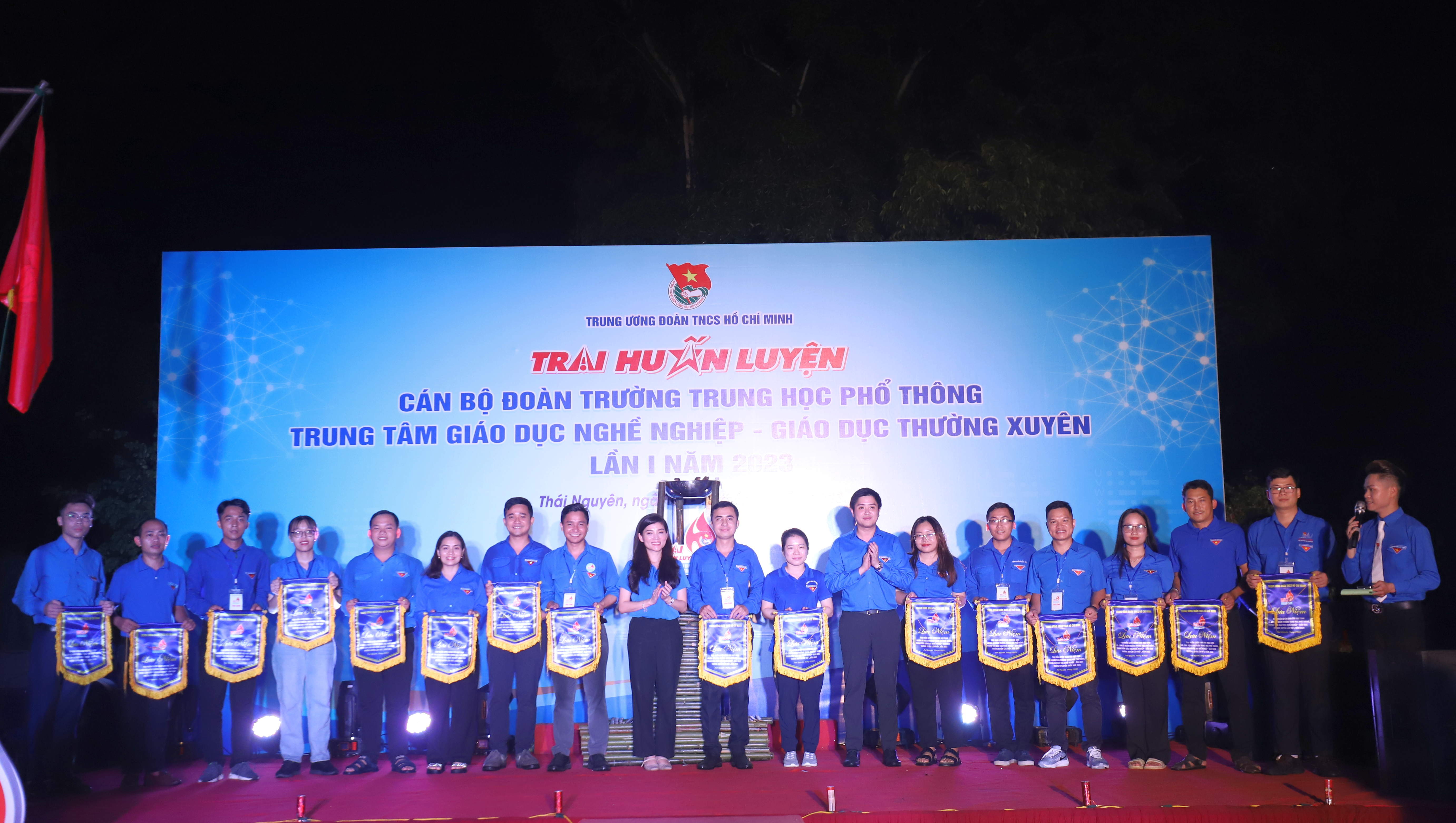 Đồng chí Hồ Hồng Nguyên tặng cờ lưu niệm cho các trại sinh tham gia trại huấn luyện